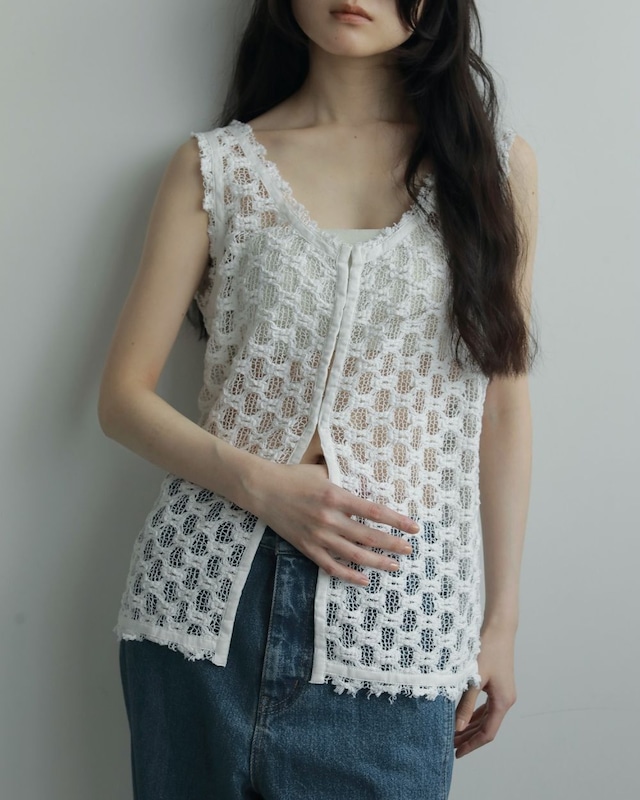 インド製のレース素材を使用したノースリーブブラウス。フロントはホックディテールでスッキリと仕上げました。 レースをカットオフした衿ぐりやアームホールのデザインもポイント。自然と腰回りから裾にかけて広がる位置にホックの止まりを設定しているので、着るだけでニュアンスあるスタイリングに決まります。前後2WAYで着用可能で、シンプルなレーストップスとしてジャケットのインナーとして着回したり、スタイリングに合わせてお楽しみいただけます。 【本体】綿80% ナイロン20% 【別布】綿100% COLOR ホワイト ブラック SIZE F 着丈61cm 肩幅33.5cm バスト90cm アームホール20.5cm 裾幅46cm こちらの商品は実店舗と在庫を共有しているため、完売の場合もございます。 ☆プラウザや環境によって実物とカラーが異なる場合があります。 予め御了承の程、よろしくお願いいたします。 ★不良品以外の返品交換は致しておりません。 サイズなどご確認の上ご購入していただきますようよろしくお願いいたします。 お客様のご都合による返品交換もお受けできかねます。