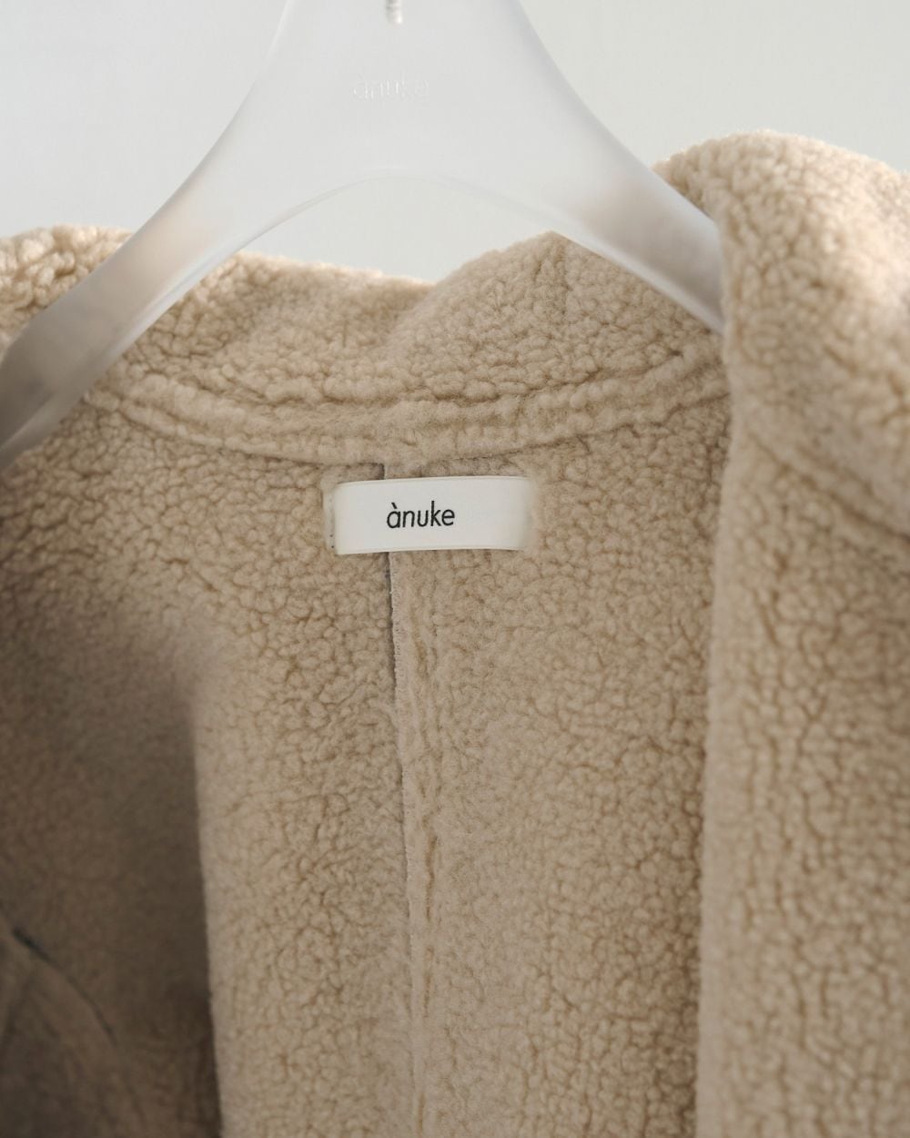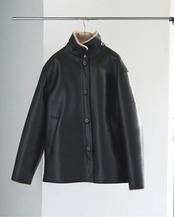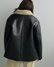 ボアカラーがポイントのエコシアリングジャケット。上品なシボ感と重厚感ある上質なエコレザーに、程良い粒感のボア素材をボンディングした生地です。フライトジャケットデザインとワイドシルエットでメンズライクに仕上げました。襟を立ててタブを留めて着るのもおすすめ。ボア面が首元を包み込み、寒い日も暖かく過ごしていただけます。