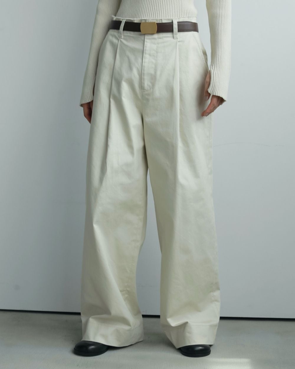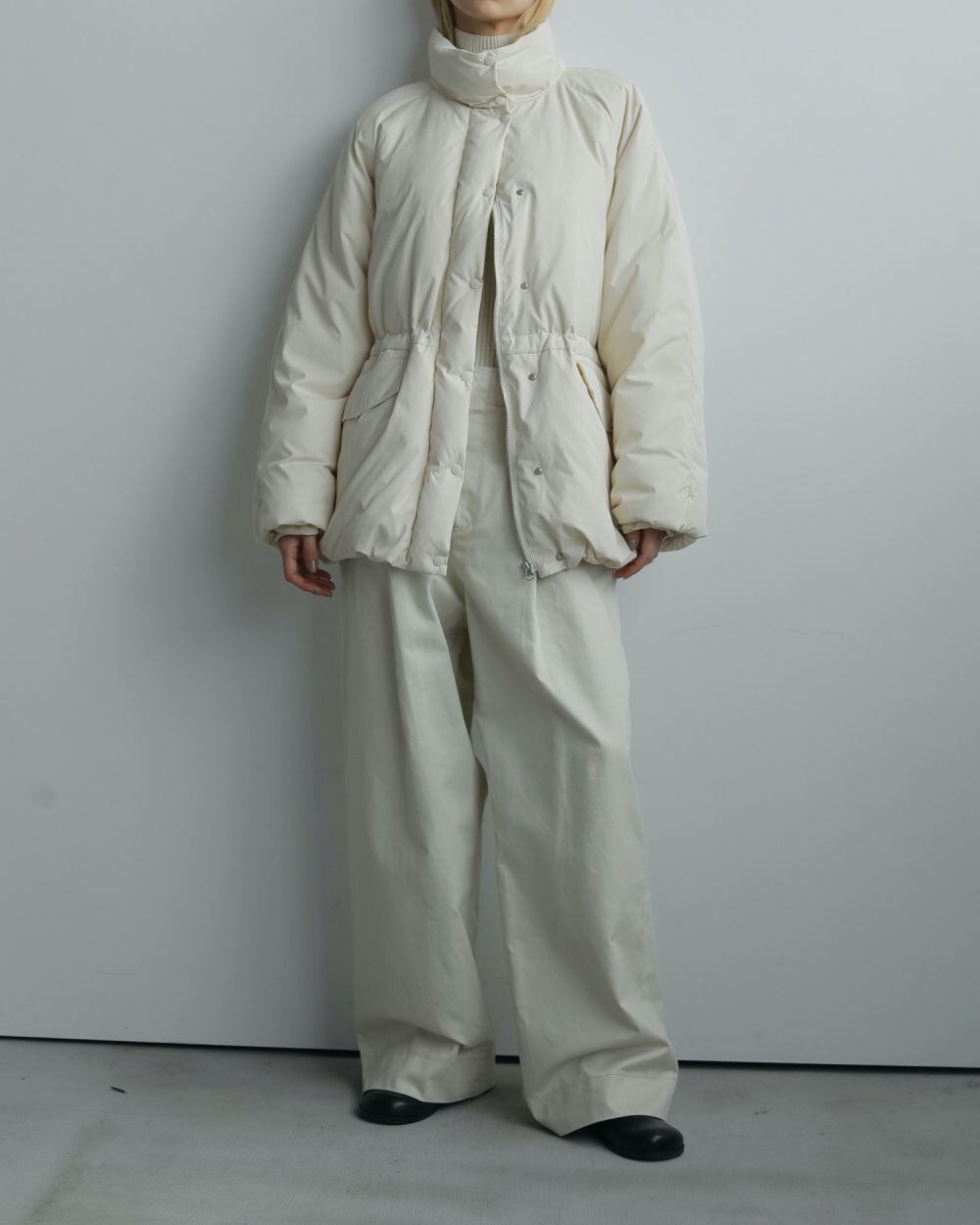 少しハリのある綾目が効いたチノ素材のワイドパンツ。太めのタックを入れ、裾までストレートに落ちるワイドシルエットに仕上げました。ウエスト端がカットオフデザインになっているのもポイント。トップスをインした際もポイントになります。冬のコーデをトーンアップさせてくれるアイボリーと、少しくすんだ落ち着いたブラウンの2色。どちらも幅広いスタイリングにマッチしやすい1本です。