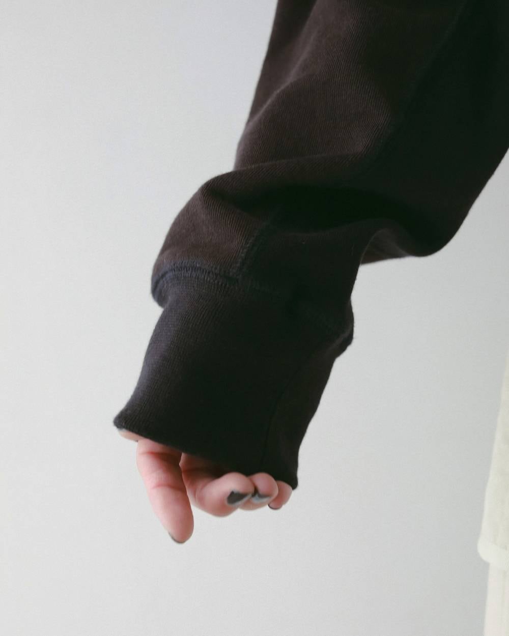 杢調の素材を使用した配色デザインがポイントのカットソートップス。身頃は裏毛素材、襟ぐりと袖口と脇パーツは変形リブを使用してます。どちらも同じ2色の糸をミックスさせて作りながらも、素材が変わるだけで色の見え方が異なる点を活かし、配色に仕上げたのがポイント。配色感が分かりやすいチャコールグレーと、微配色でシックな印象のブラウンの2色展開。切り替えには配色に合わせた表振りステッチを効かせています。幅広いボトムとバランス良く着ていただきやすい、短過ぎないショート丈で、ワイドなシルエットのラフな一枚。