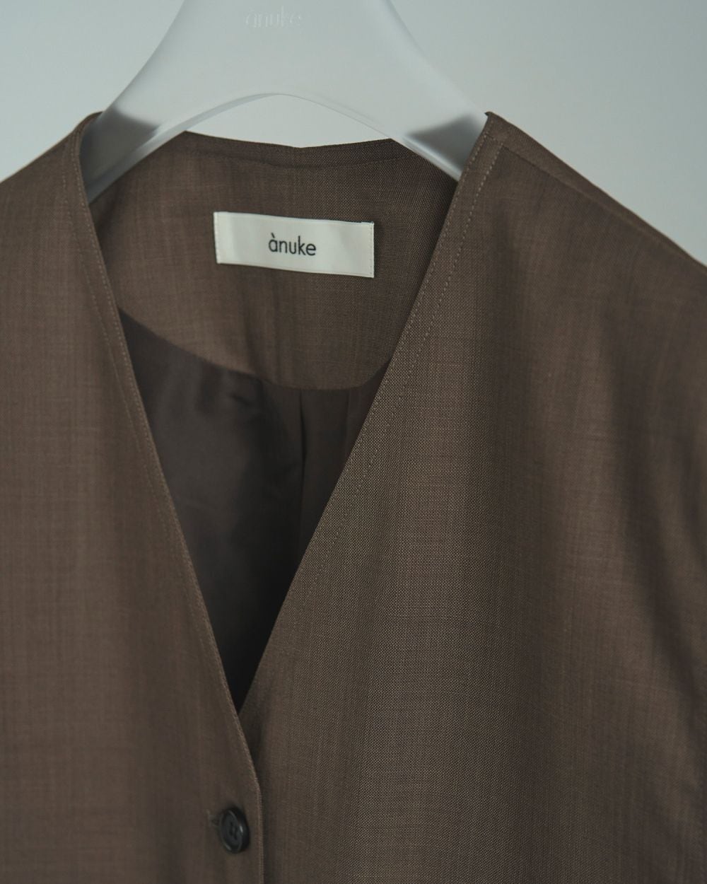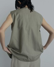 程良くゆるめのシルエットとスッキリミニマルなデザインで仕上げたVネックベスト。サラッとした風合いのウール混の杢調素材で、大人っぽく着ていただける一枚です。レイヤードしたり、フロントボタンを閉じてプルオーバーとして着るのもおすすめ。同素材のCenterpress Half Pantsとのセットアップスタイルも楽しんでいただきたいです。