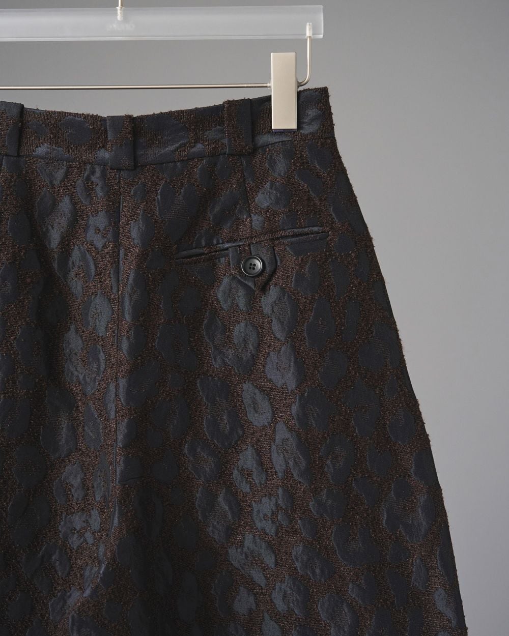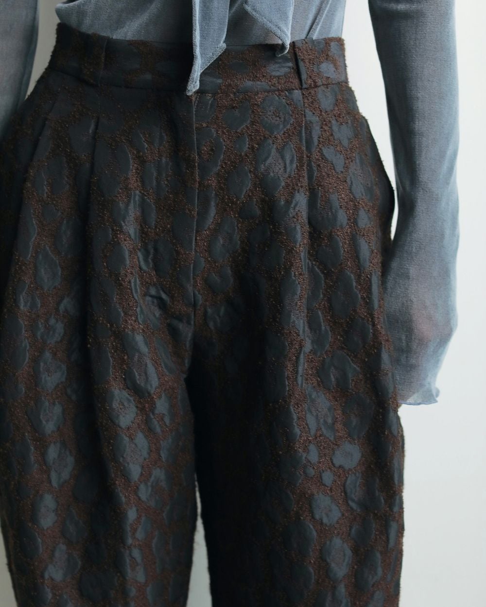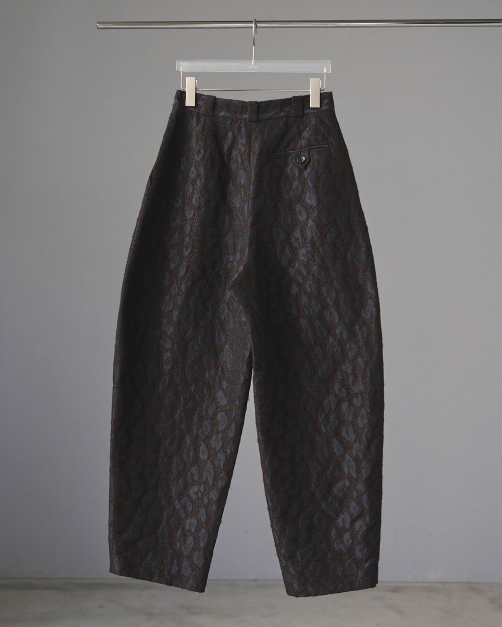 桐生で織り上げたオリジナルの国内素材。細いループ糸と微光沢糸を使い、立体感あるジャガード生地です。派手過ぎないレオパード柄で上品に着ていただけます。フォルムの出る少しハリのある素材で、ダブルタックを入れたコクーンシルエットに仕上げました。同素材のLeopard Jacquard JacketやLeopard Jacquard Vestとセットアップで着るのもおすすめです。