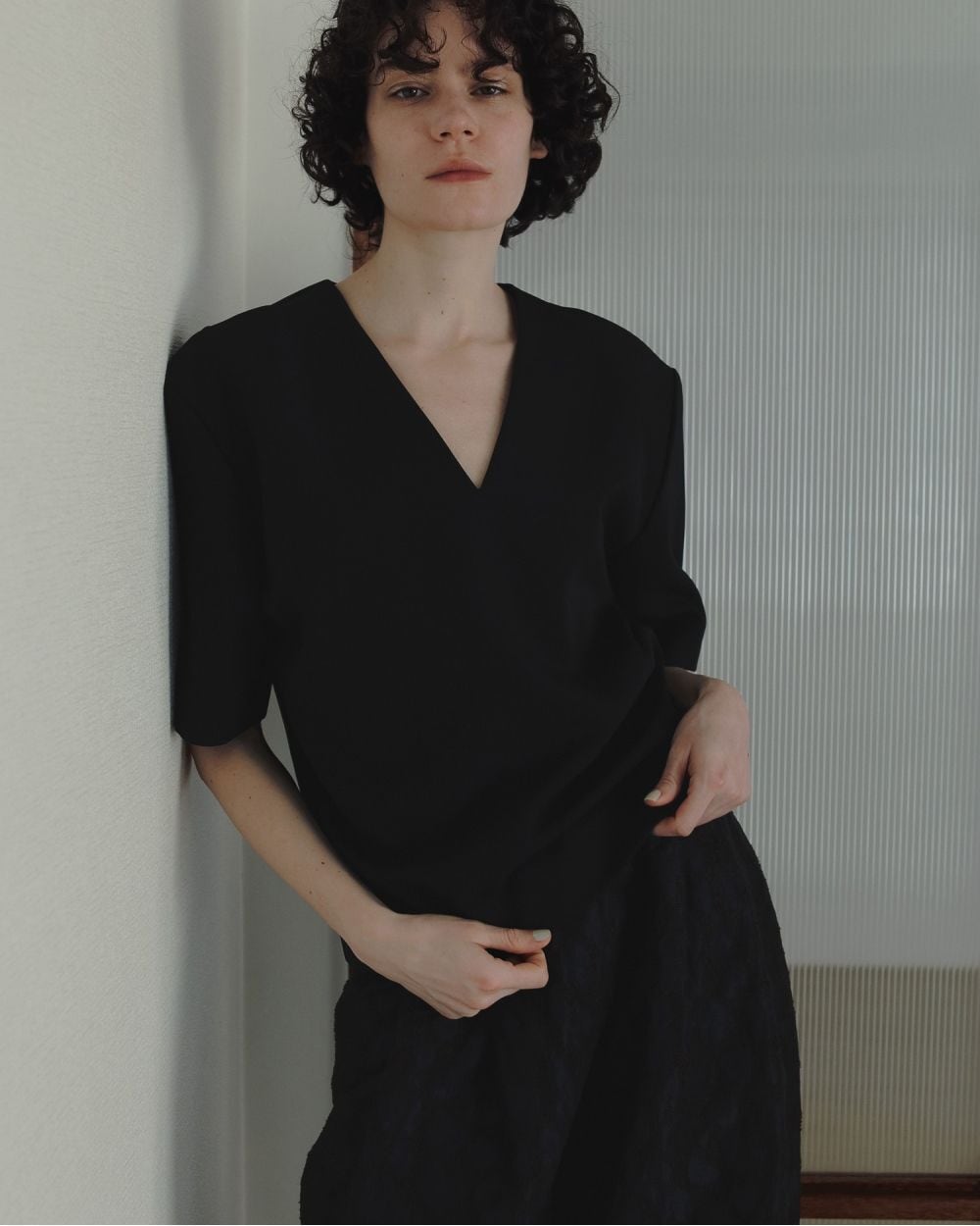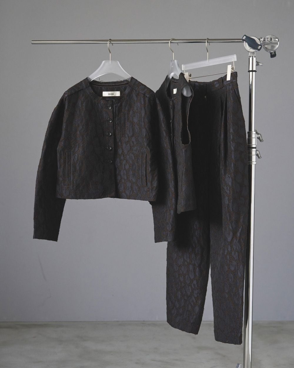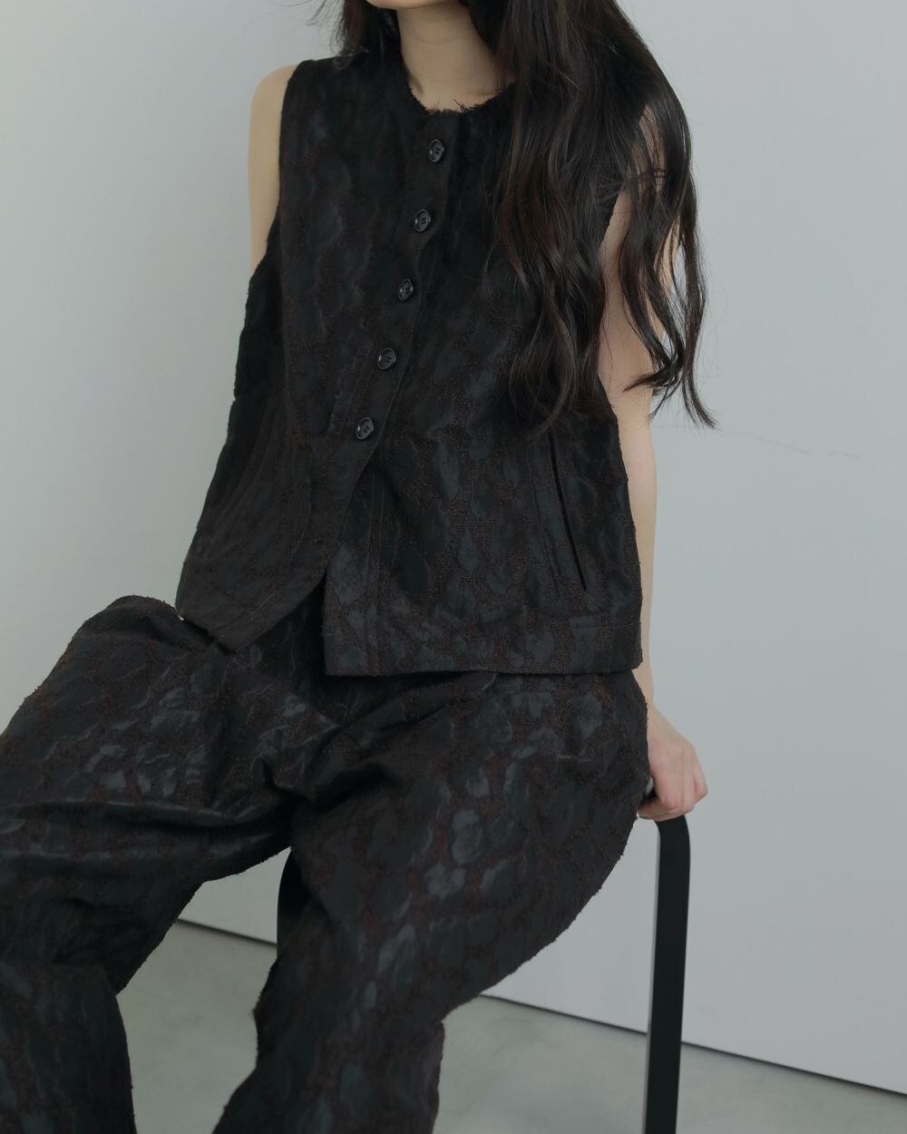 桐生で織り上げたオリジナルの国内素材。細いループ糸と微光沢糸を使い、立体感あるジャガード生地です。派手過ぎないレオパード柄で上品に着ていただけます。フォルムの出る少しハリのある素材で、ダブルタックを入れたコクーンシルエットに仕上げました。同素材のLeopard Jacquard JacketやLeopard Jacquard Vestとセットアップで着るのもおすすめです。