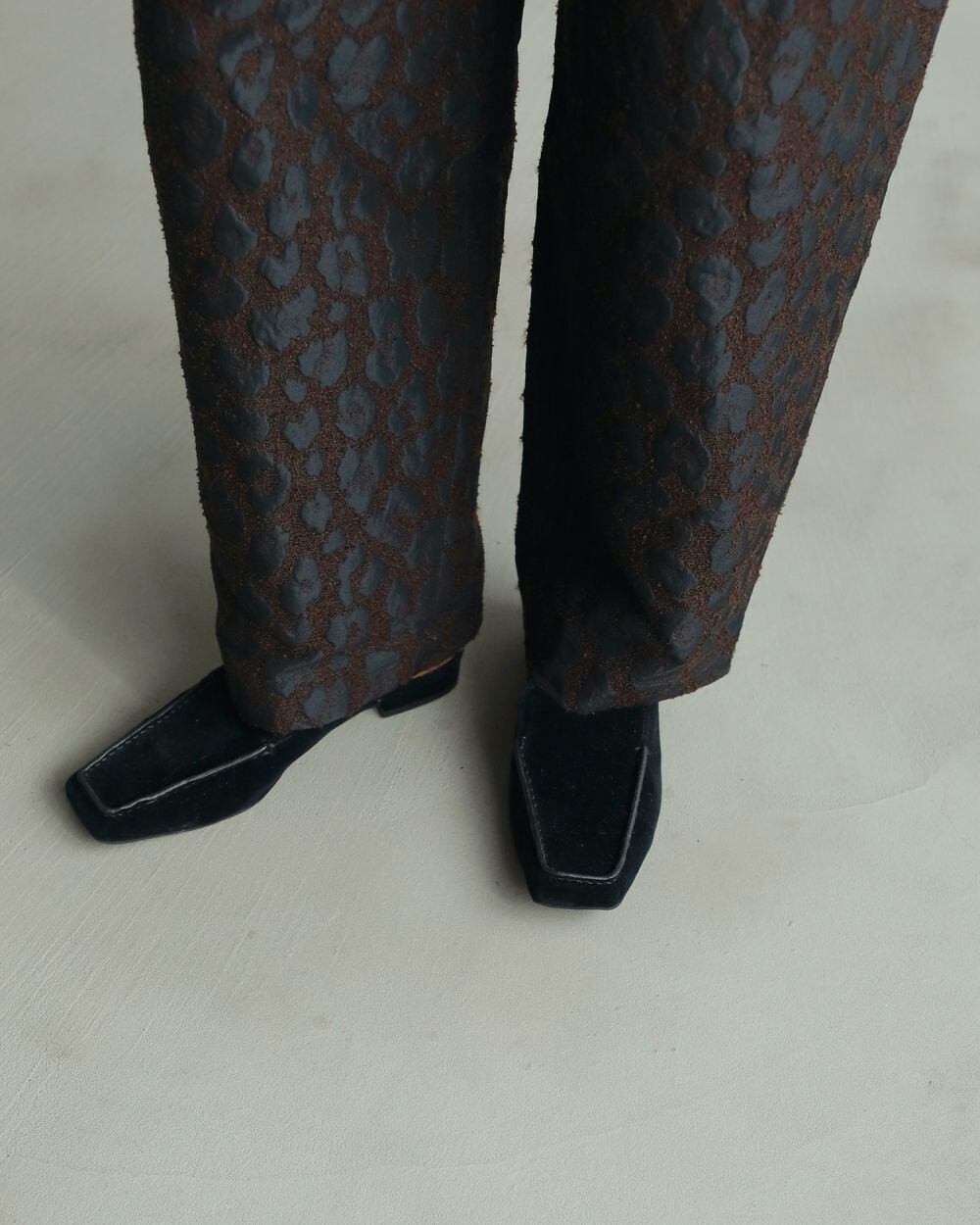 シックな配色で仕上げたレオパード柄パンツ。