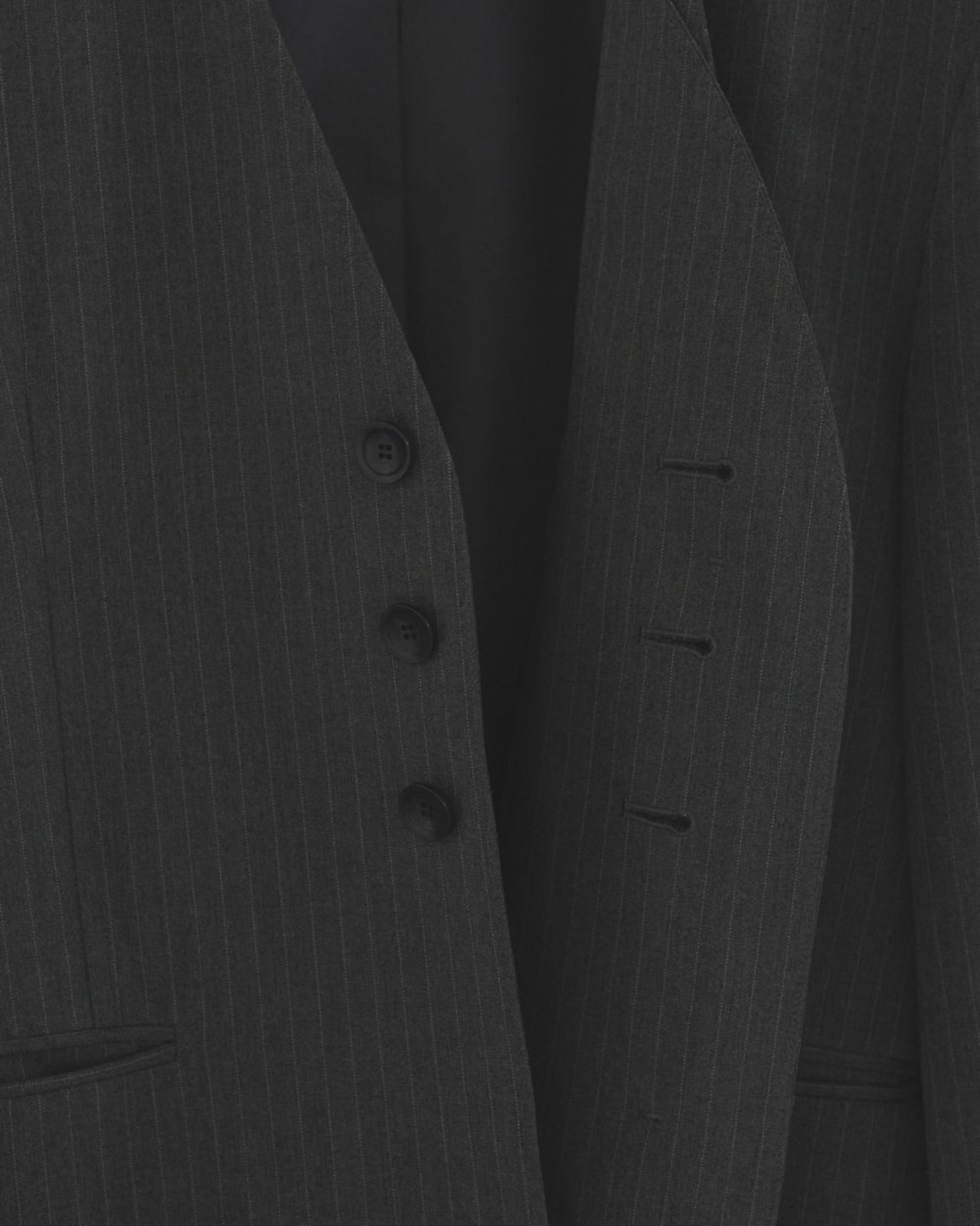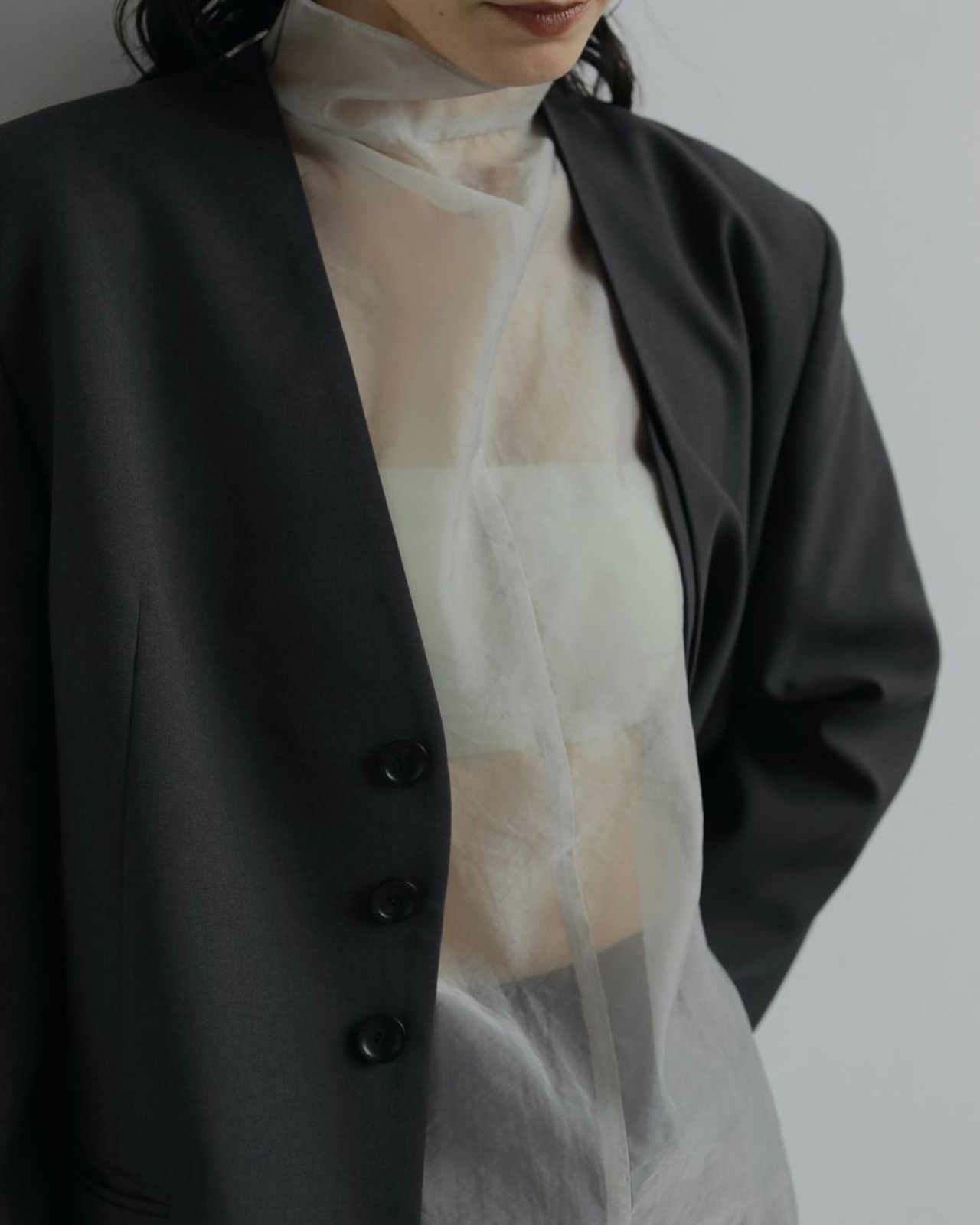 ストレッチ性のある平織りの杢調素材で仕上げたノーカラージャケット。しわになりにくい、肌触りの良い素材です。左身のフロントを2枚重ねたディテールがポイント。前を閉じるとボタンが見えず、ポケット口は細めの両玉縁ポケットでスッキリと仕上げています。ミニマルなデザインながら、重なったフロントデザインがスタイリングのアクセントに。同素材のHeather Stretch PantsやHeather Stretch Middleskirtとセットアップで着るのもおすすめ。グレーは細ラインのストライプ素材。チャコールグレーは少しブルー味のあるなんとも言えない絶妙な色合いで、着るだけで洒落感の出るカラーです。