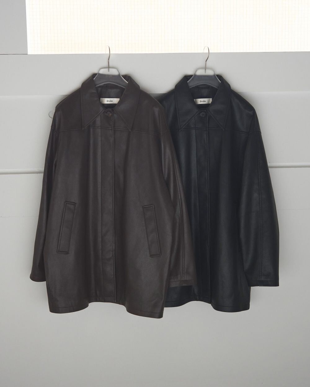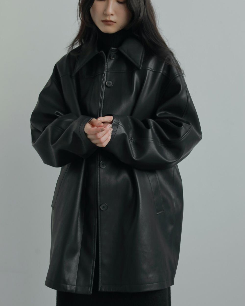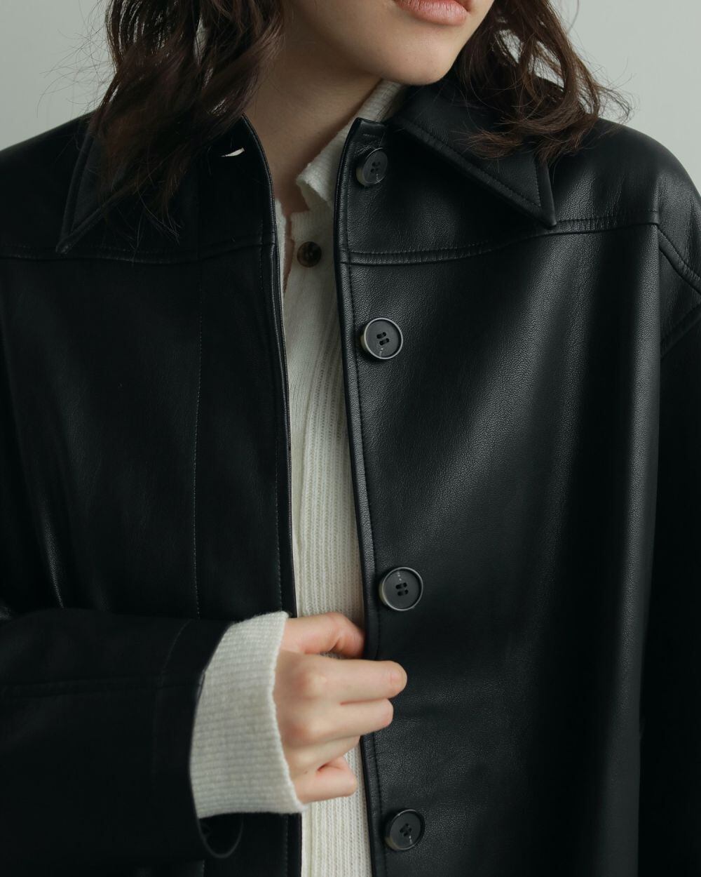 昨年もご好評いただいたエコレザージャケット。上質なエコレザーを使用しました。適度な光沢、細かいシボ、程よいハリ感のある生地で、カジュアルなアイテムですが上品に見せてくれます。オーバーサイズなので、中に肉厚のニットも着ていただけます。袖にタックを入れて少丸みを帯びたシルエットに仕上げています。幅広いスタイリングに合わせやすく、秋だけでなく、寒さの残る春先など、長く使っていただける一枚です。