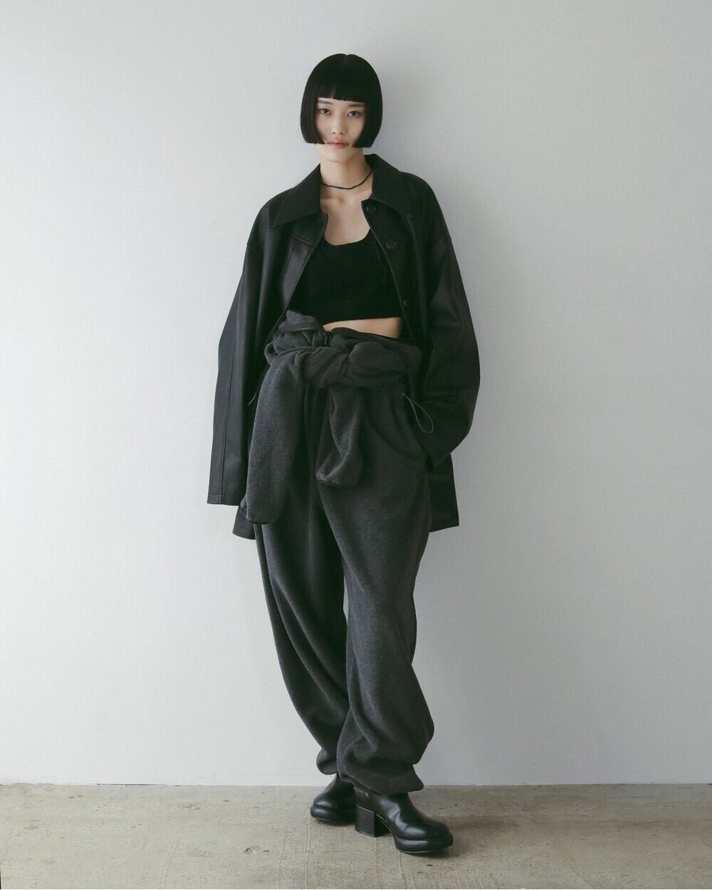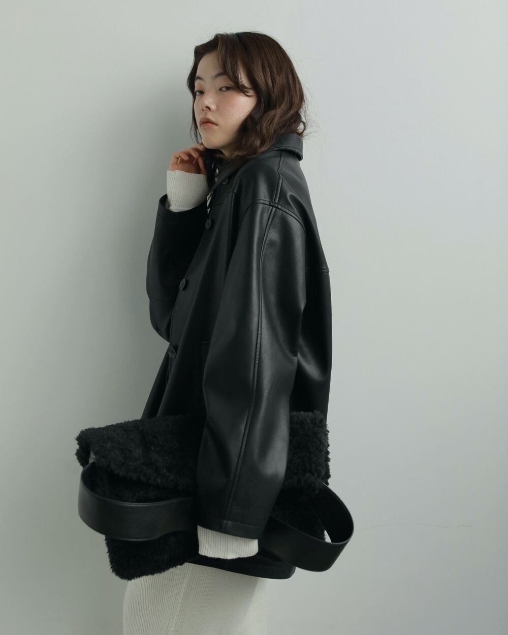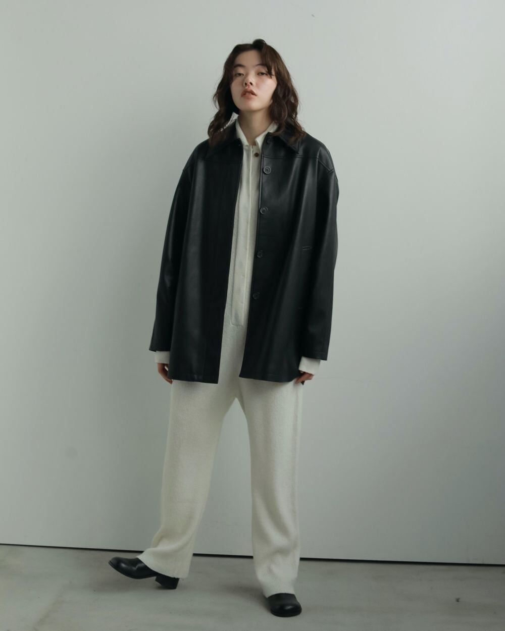 昨年もご好評いただいたエコレザージャケット。上質なエコレザーを使用しました。適度な光沢、細かいシボ、程よいハリ感のある生地で、カジュアルなアイテムですが上品に見せてくれます。オーバーサイズなので、中に肉厚のニットも着ていただけます。袖にタックを入れて少丸みを帯びたシルエットに仕上げています。幅広いスタイリングに合わせやすく、秋だけでなく、寒さの残る春先など、長く使っていただける一枚です。