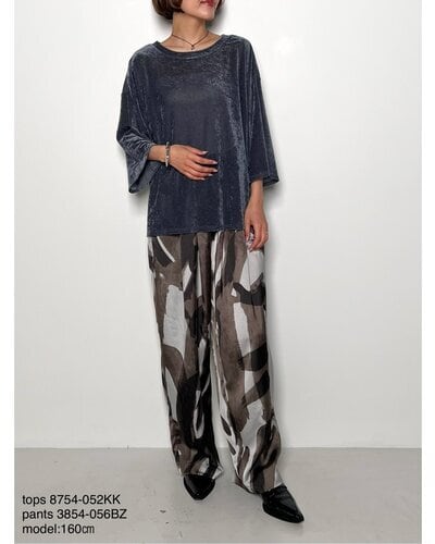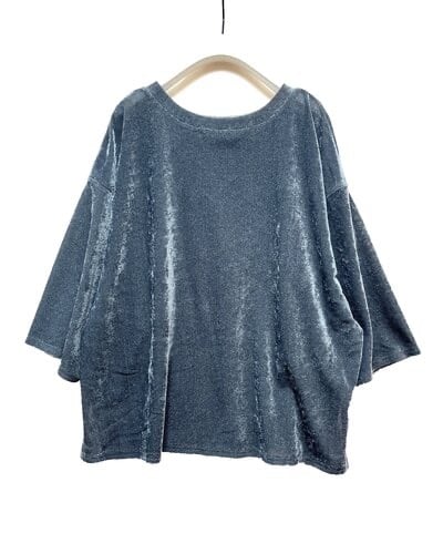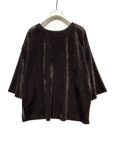 ベロアメッシュ素材のプルオーバーは、Tシャツ型のシンプルなデザインです。ゆったりしたシルエットでも重たくならないように、詰まりすぎない衿まわりや、肘あたりにかかる袖の丈感などに拘りました。メッシュ素材にベロアの毛足と光沢がある特徴的な素材です。程良く透け感があるのでレイヤードをお楽しみいただけます。