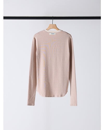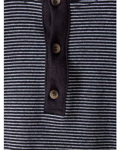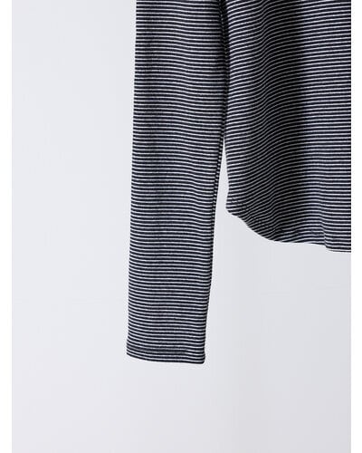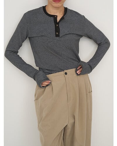 細かいピッチのミジンボーダー生地を使用したヘンリーネックロンTです。遠目で見ると無地に見えるほど、縞模様が細かいのが特徴の柄で、カジュアルながらも上品な印象を与えます。 生地は伸縮性のあるフライス生地を使用。 程よい厚みがあり、体のラインを拾いにくい素材を採用しています。 釦を開けて着ることで、少し開いた襟元が顔まわりをすっきり見せつつ、カジュアルさと抜け感を演出できます。ジャケットやカーディガンのインナーとして着ても、首元にアクセントがつくためおしゃれにスタイリングが決まるアイテムです。