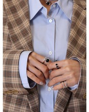 艶感のあるブラックオニキスを乗せたオーバルTOPが印象的なニュアンス感とモード感が漂うリング。両面仕様のTOPが付いた厚みのあるリングは程良いボリューム感があるので着けるだけで手元にアクセントをプラスしてくれます。TOPを取り外して開きがある方を表にしても◎横長のオーバル型TOPは表面がオニキス、裏面はシンプルなメタルになっており取り外しが可能です。TOP付リング内側に「CHIGNON」刻印入り。
