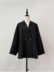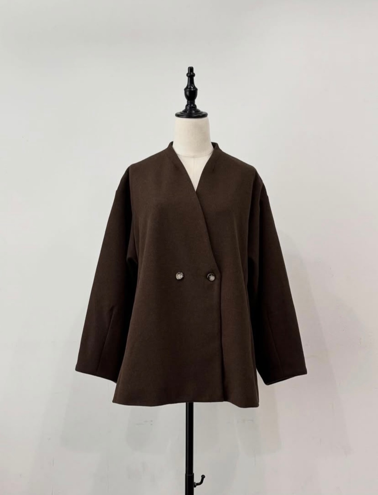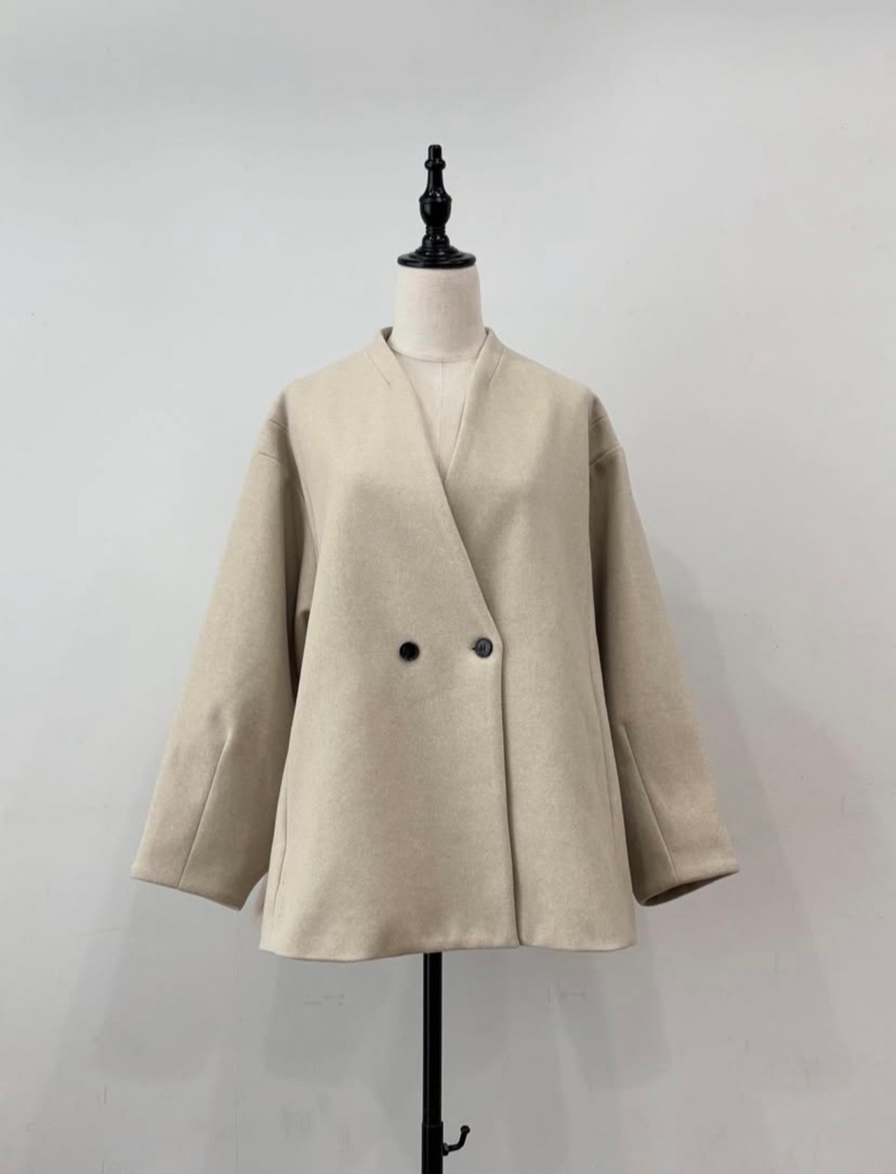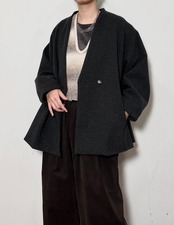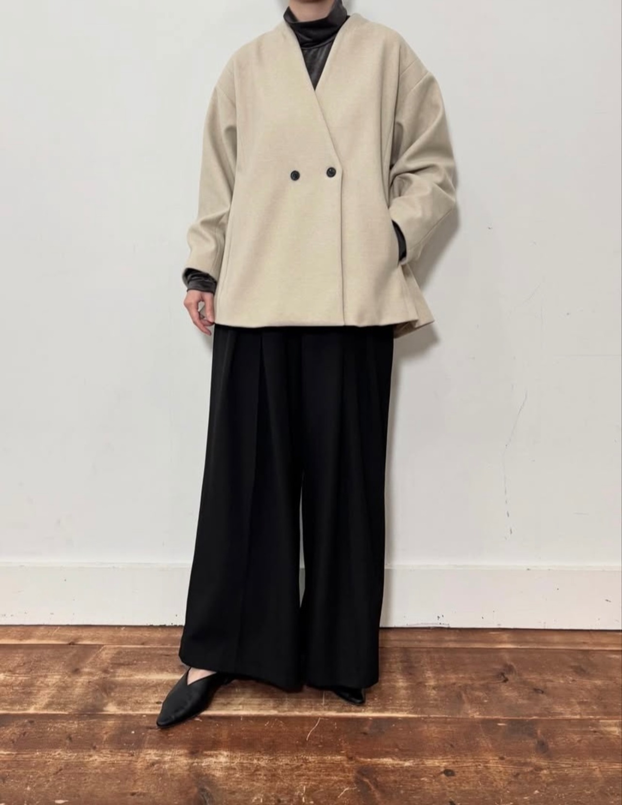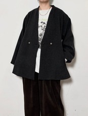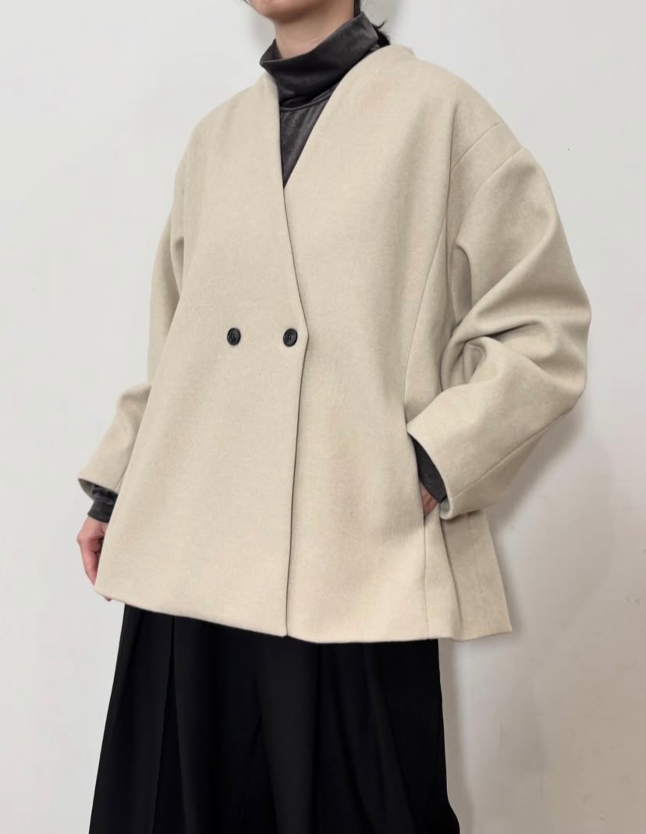 ダーツを入れて丸いシルエットの袖が特徴的なノーカラージャケット。