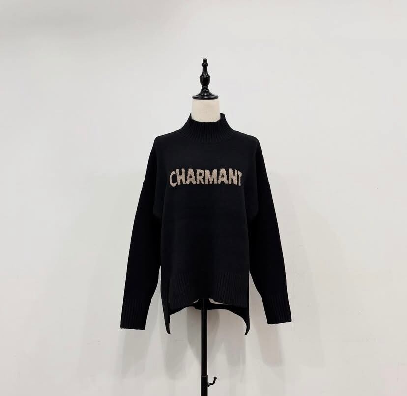 ゆったりとした身幅にスリットで抜け感を出してあり、前振りの切り替えで立体感のあるデザインになっていて、シンプルながらもシルエットにこだわったハイネックニットトップス。