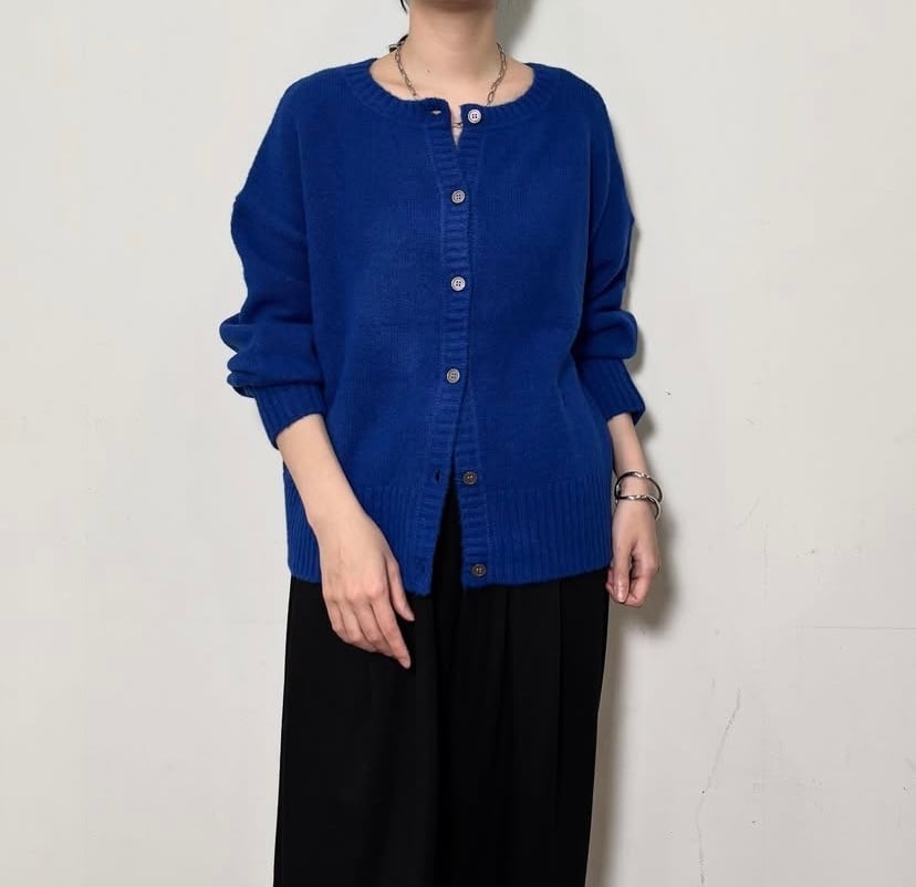 クルーネックの前後2wayタイプのニットカーディガンです。 ボタン開きを後ろにすることでプルオーバーとして着用する事も可能です。 袖がやや袖口にかけてバルーン調にすることできれいめなスタイルにもおススメです。