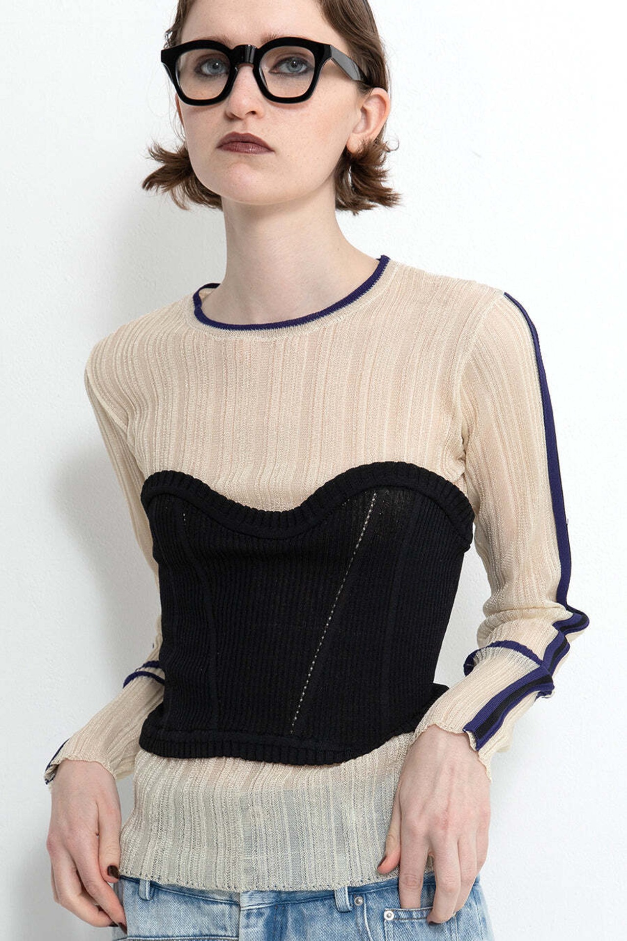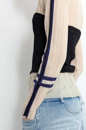 ベアトップシアーニット。ライン入りのリブニットにベアトップをレイ ヤードしたようなデザイン。ランダムリブのインナーニットは、細い光 沢のある糸でシアー感があり、ドライタッチで軽い。袖山には、3本ラ イン、袖口には2本ライン、襟ぐりには1本ラインを入れてトラッドな雰 囲気に。ベアトップは、光沢のない透けない糸で、リブとアイレットで V字の女性らしいラインに編んでいるのがポイント。