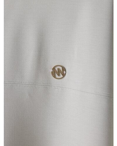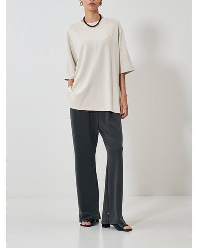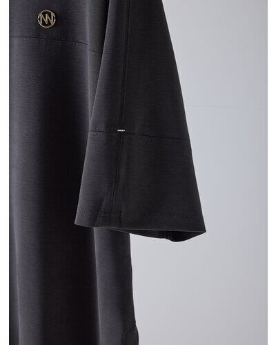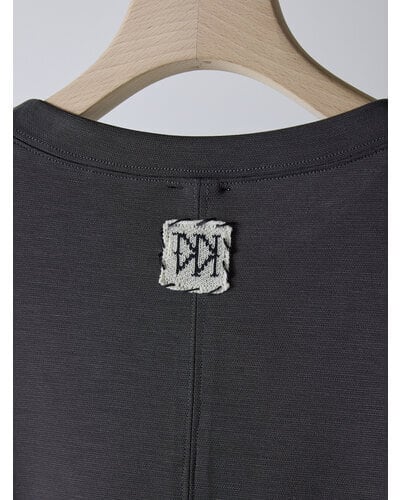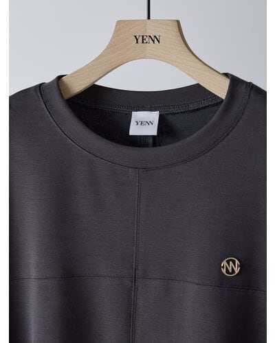 肌に心地よく馴染むソフトな風合いが、カジュアルなアイテムでありながら大人の余裕を感じさせます。フロントには十字に切り替えを入れ、さらにステッチを効かせることで、シンプルなデザインに奥行きと立体感をプラス。胸元にあしらったゴールドのYENNチャームがさりげないアクセントとなり、女性らしい華やかさを引き立てます。