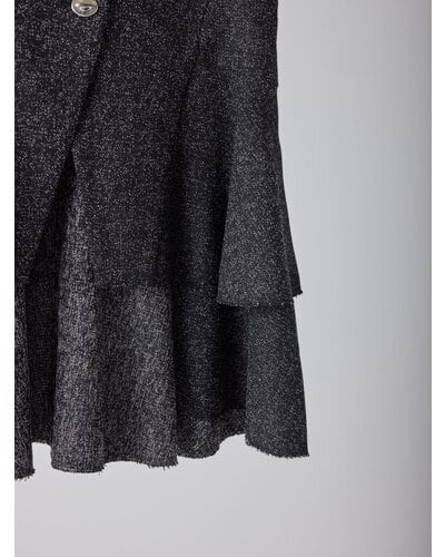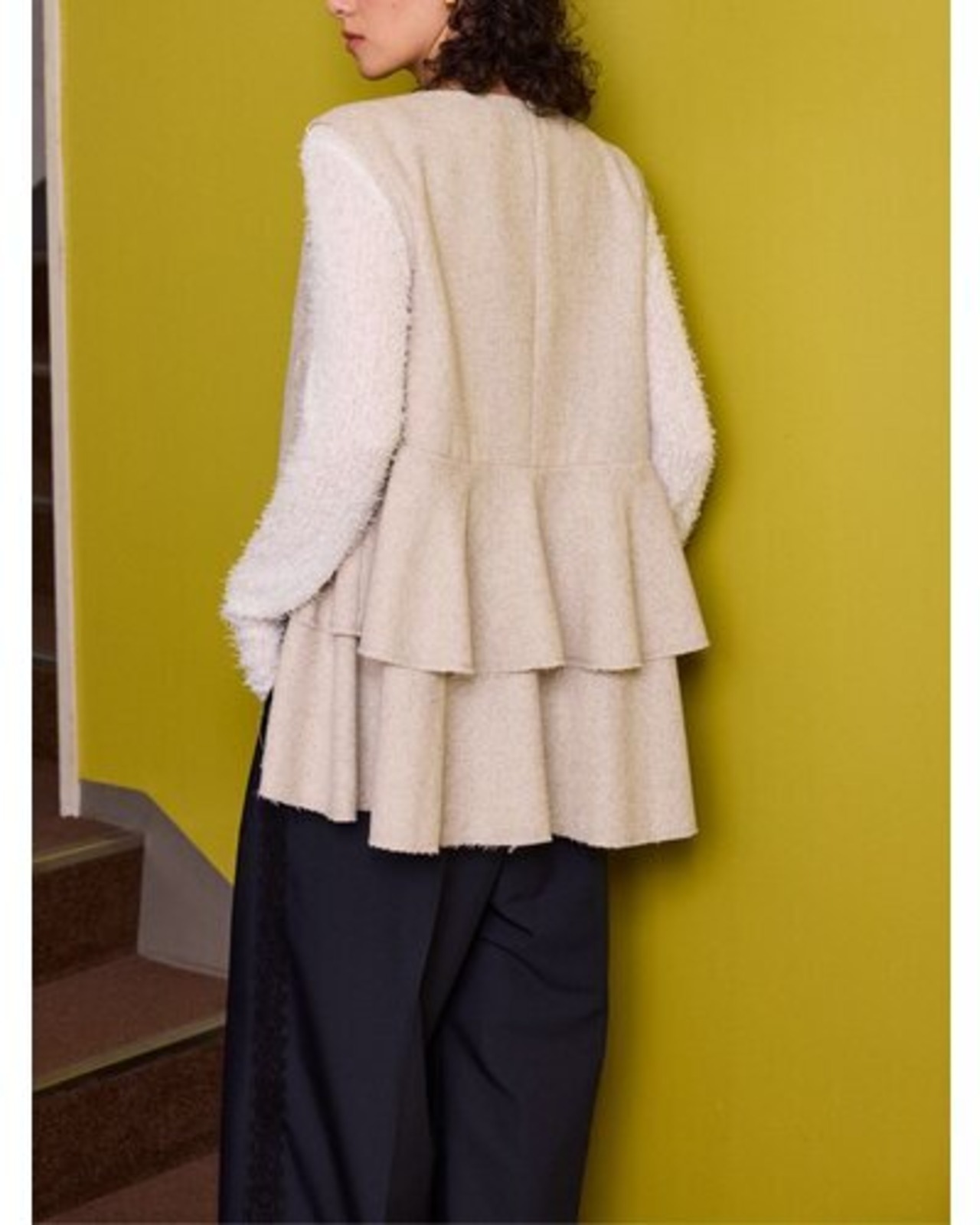 上質なツイードを使ったジレは、シャープなネックラインで顔まわりをすっきり見せながら、サイドからバックにかけて広がる2段のティアードで、ふわっと大人の可愛いらしさを演出。