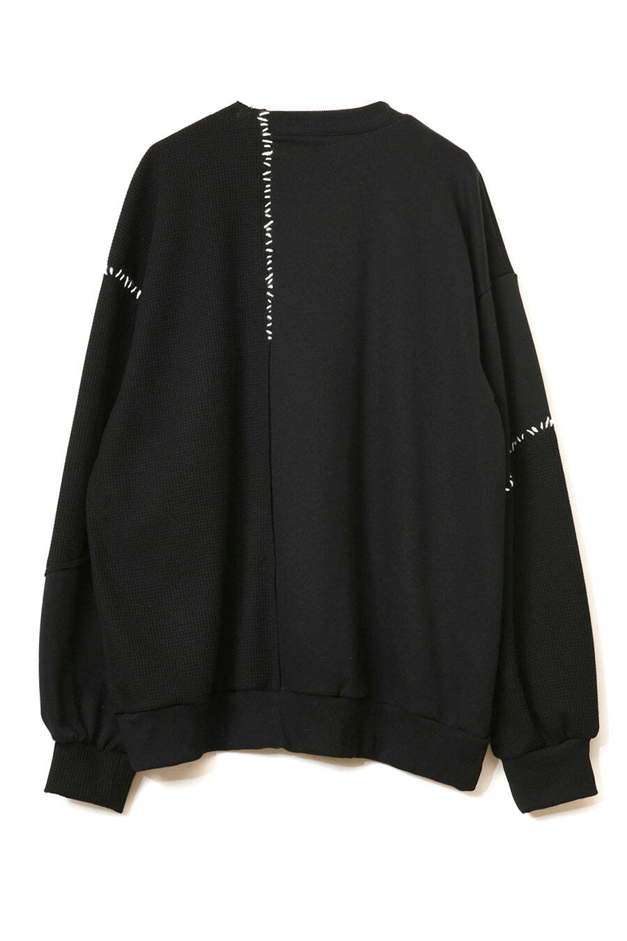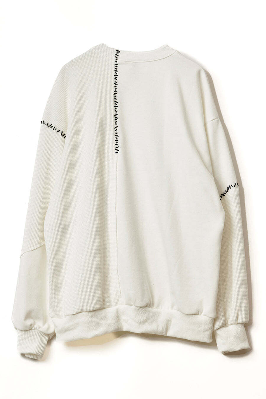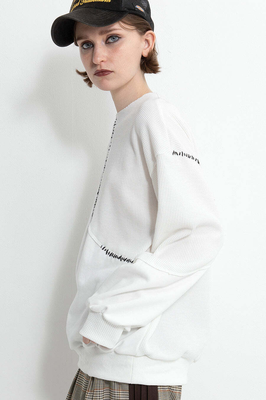 凹凸感のあるワッフルと裏毛の異素材を切り替えた、表情のあるオーバーサイズプルオーバー。程よい凹凸感のあるワッフル生地と柔らかな裏毛素材を組み合わせ、シンプルながらも奥行きのあるデザイン。切り替え部分に施した配色ステッチもさりげないアクセントに。ホワイトとブラックはクリーンな印象、ゆったりとしたサイズ感で、抜け感もあり、ボトムスを選ばす着用できるのもうれしいポイント。