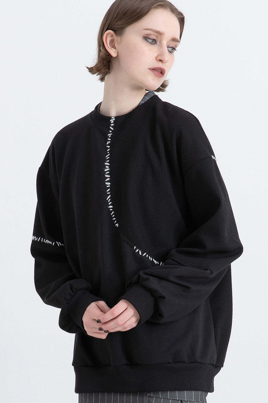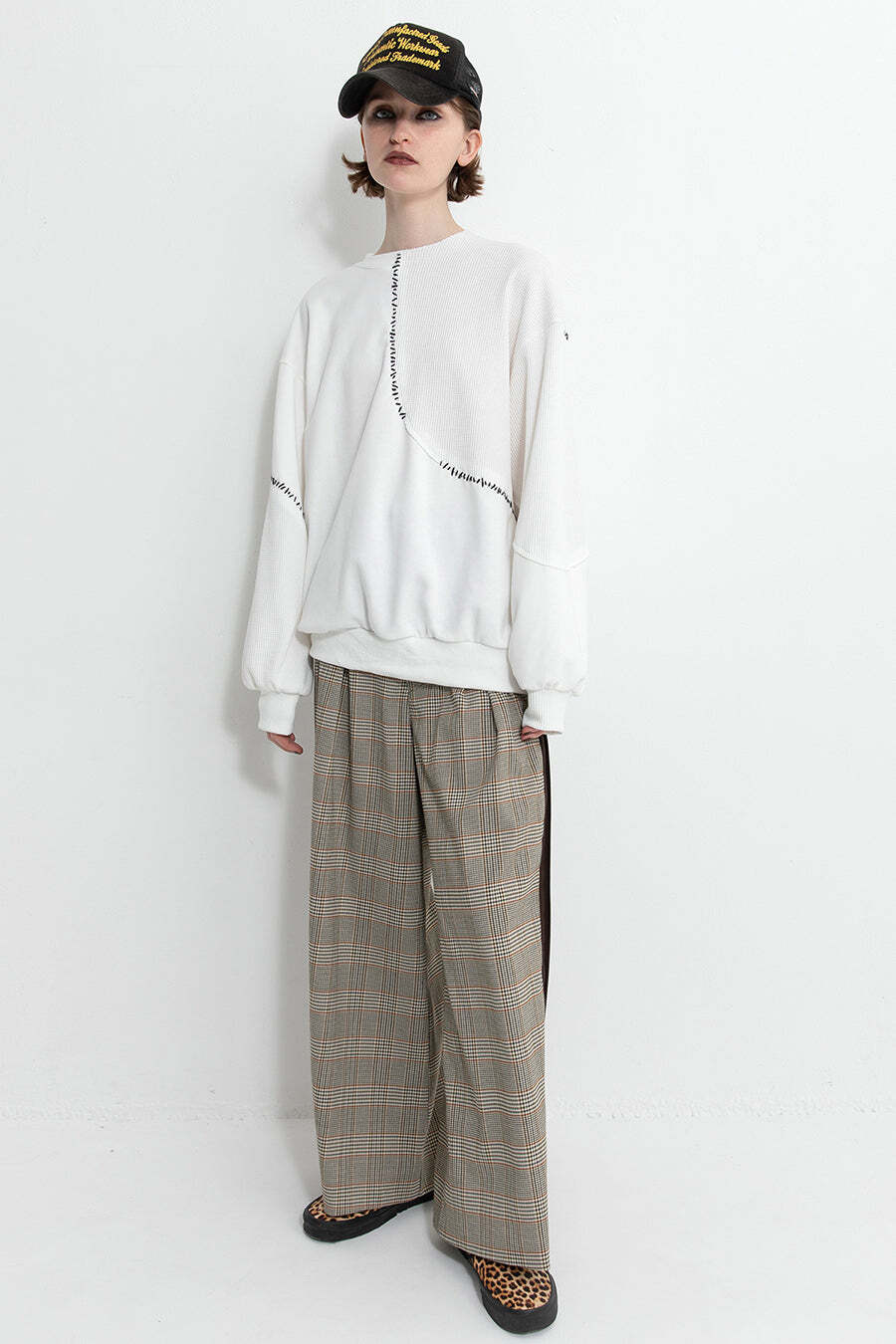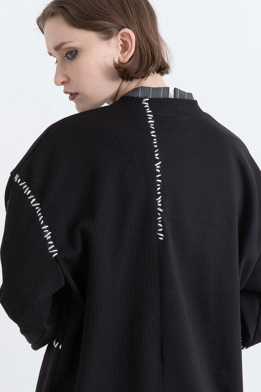凹凸感のあるワッフルと裏毛の異素材を切り替えた、表情のあるオーバーサイズプルオーバー。程よい凹凸感のあるワッフル生地と柔らかな裏毛素材を組み合わせ、シンプルながらも奥行きのあるデザイン。切り替え部分に施した配色ステッチもさりげないアクセントに。ホワイトとブラックはクリーンな印象、ゆったりとしたサイズ感で、抜け感もあり、ボトムスを選ばす着用できるのもうれしいポイント。