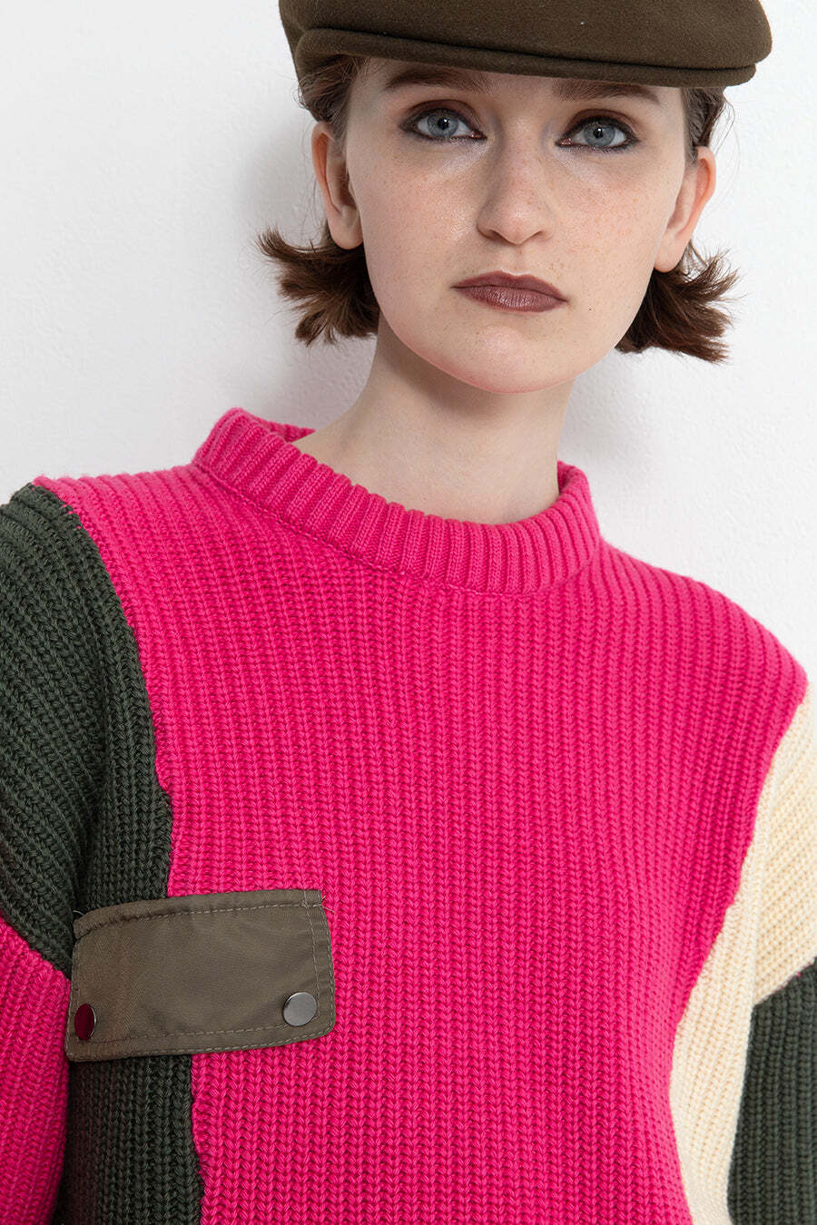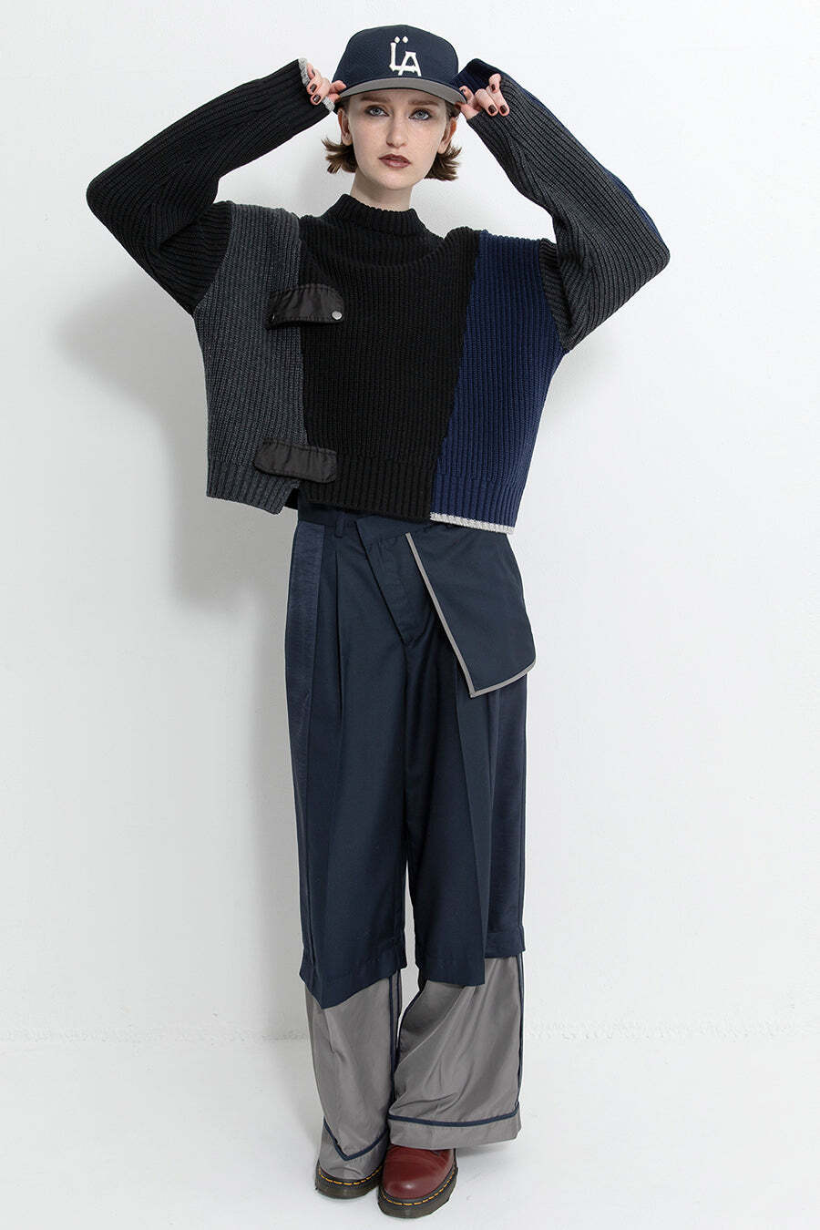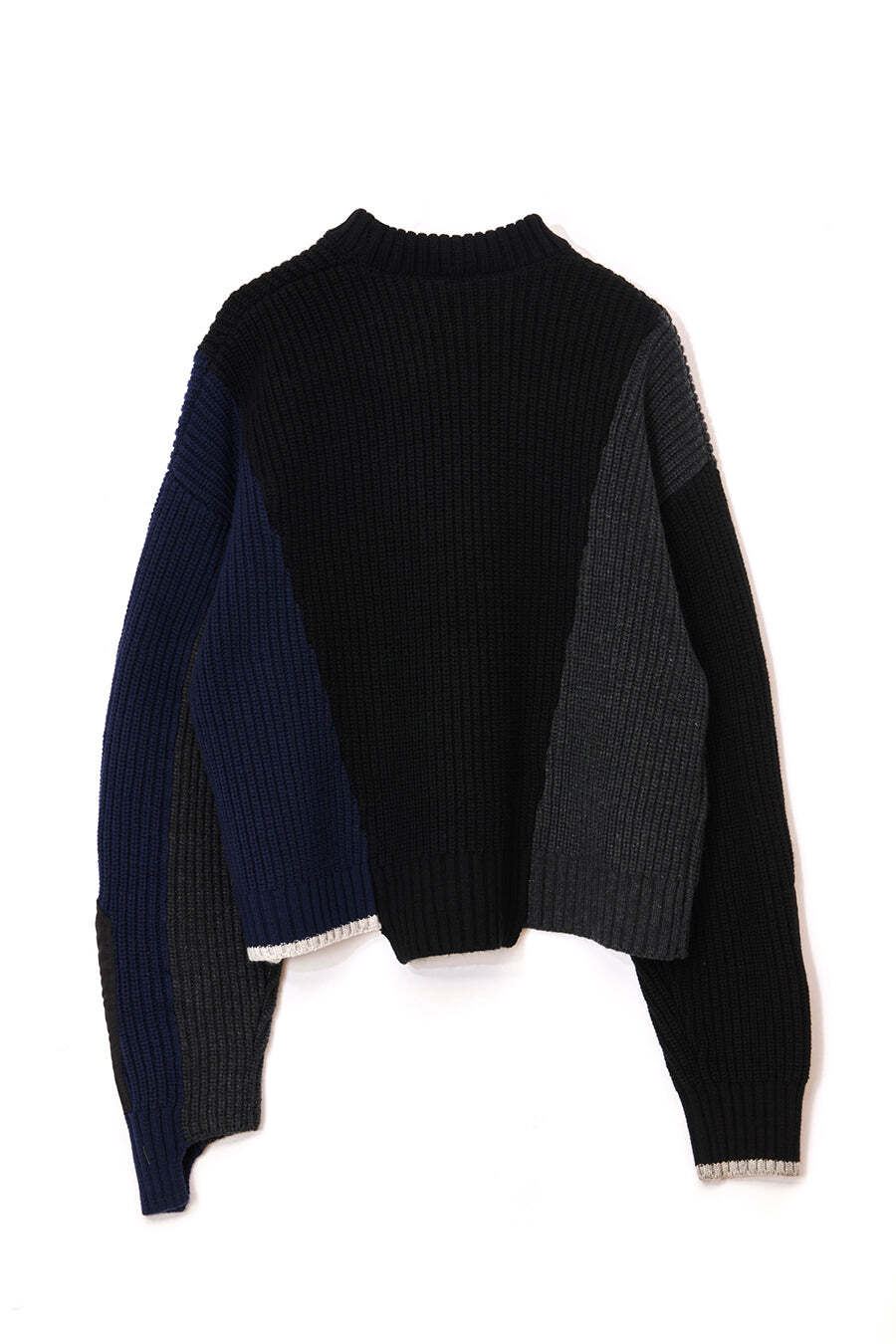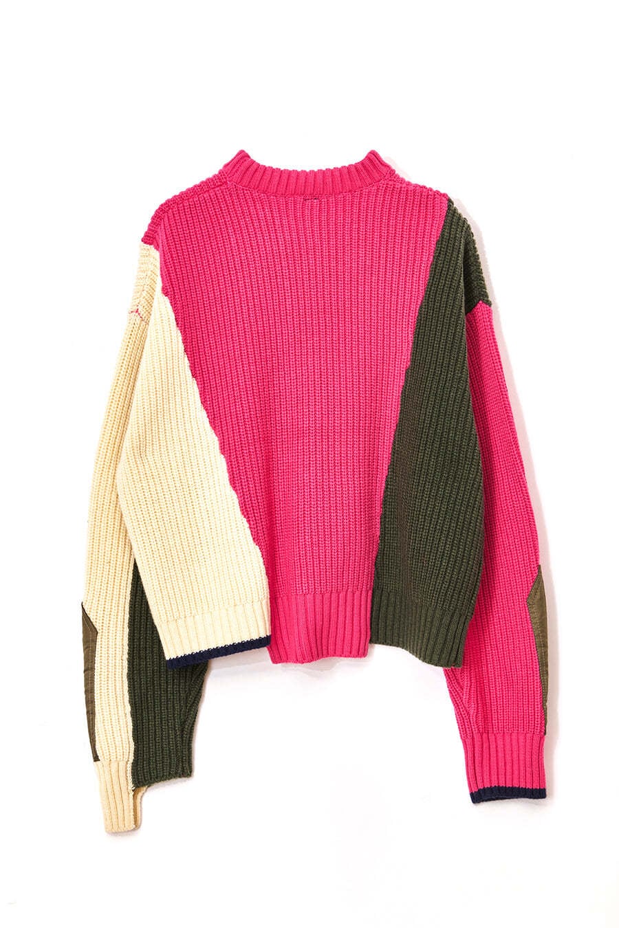 飾りフラップ付きのカラーブロックニット。昨年も人気だったナイロンツイルのポケット付きショート丈ローゲージニットは、今年は3色のアシンメトリーカラーブロックにアップデート。身頃左下と右袖口のラインがアクセントになり、アーミーテイストのデザインとのミックスが他にはないアイテム。ラムウール混の片畦編みで、型崩れしにくいのも嬉しい。オーバーサイズだが着丈が短めなので、ワイドパンツなどにも合わせやすく、緩めのバランスがトレンド◎