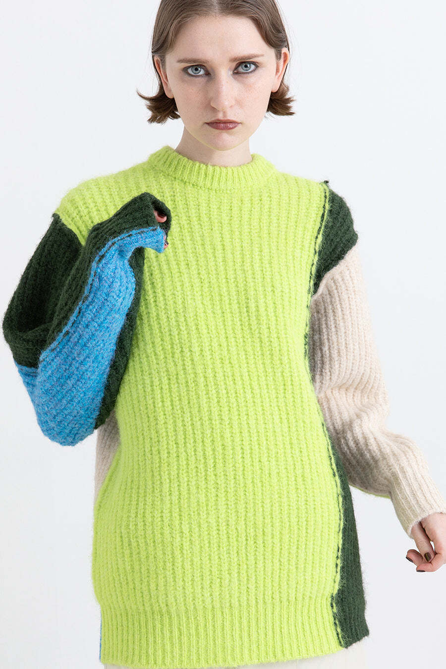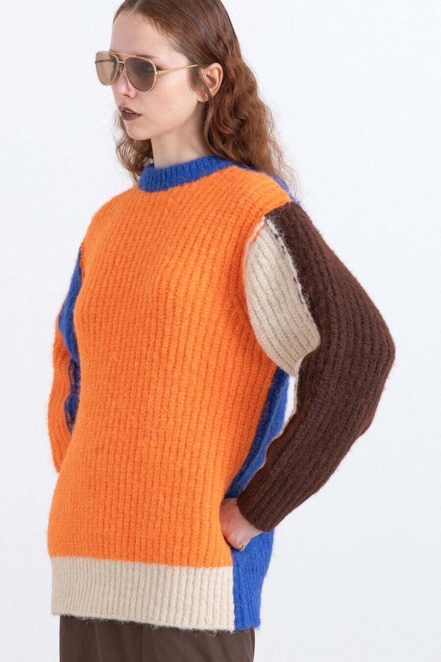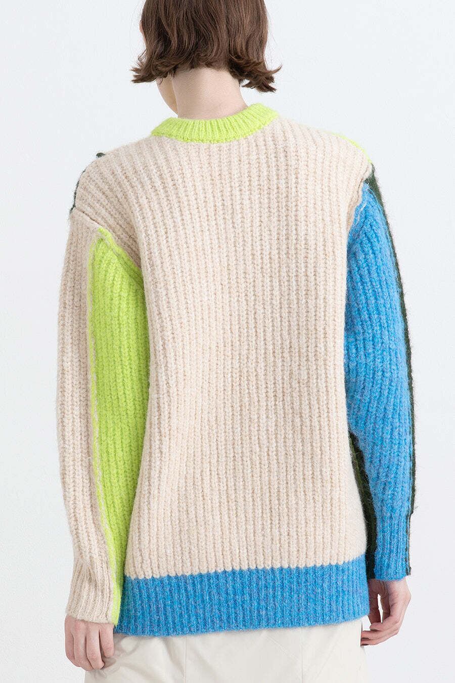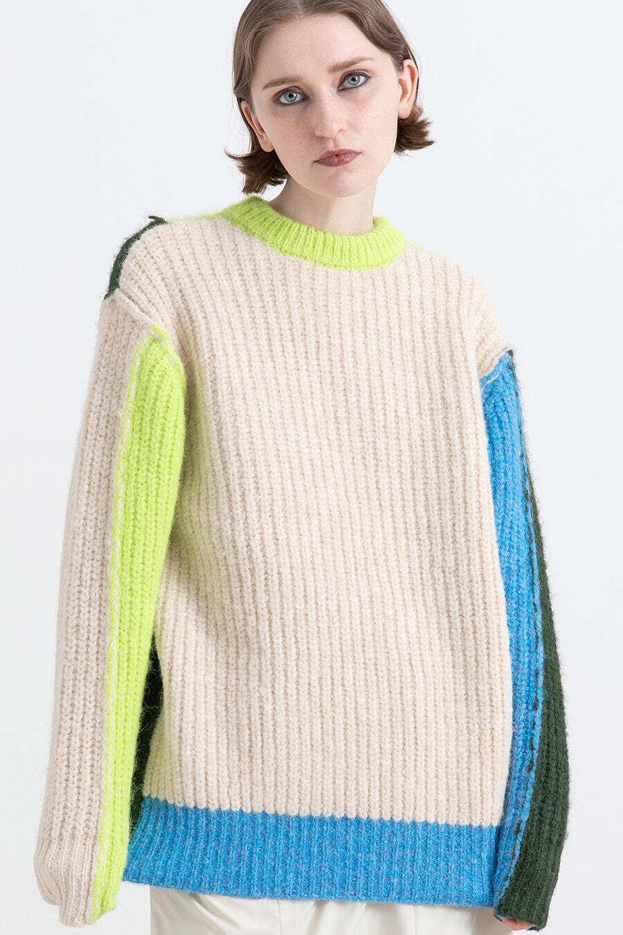 サイズ感はクルーネックのロングプルオーバーで、デザインはアシンメトリー、前後配色違いの大胆な4色の配色カラーブロックに。昨年から人気のアイテムが、前後着用出来る2WAYにアップデートして登場。リンキングを表だしにして遊び心もあり、着用すると気分がアップするカラーリングは、冬のスタイリングにおすすめの1枚。