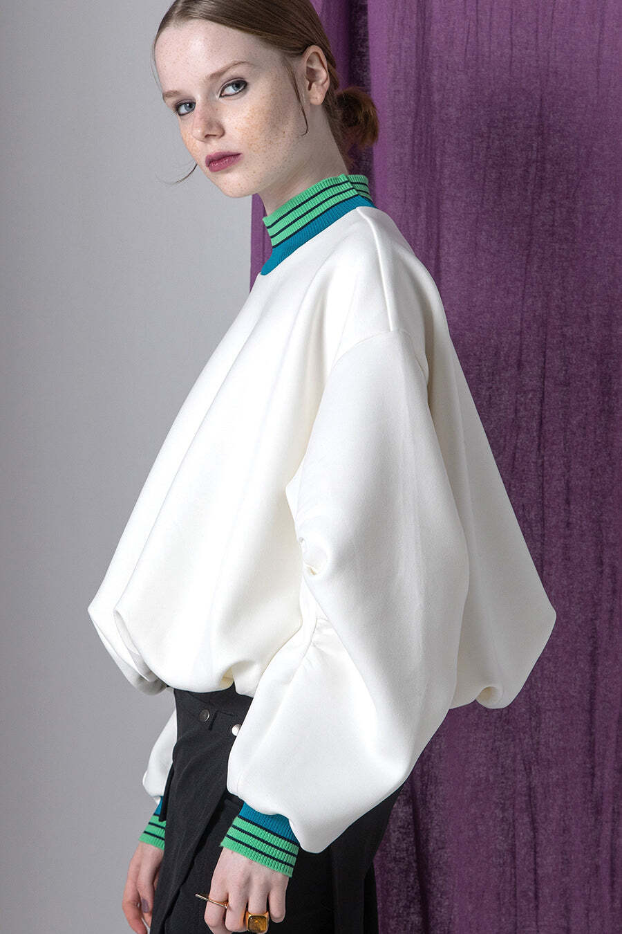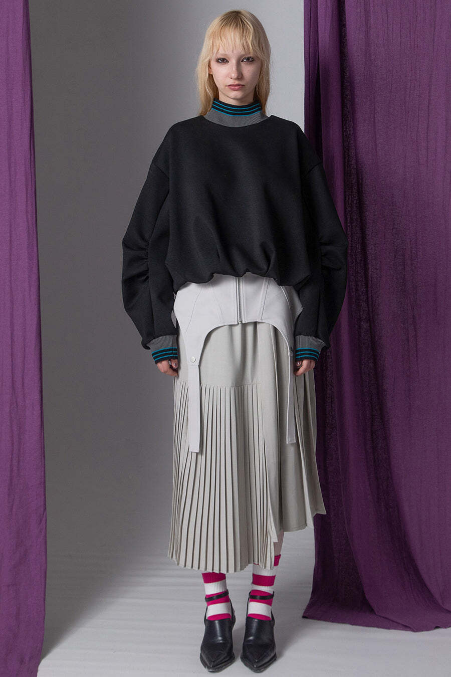 コンパクトな着丈とボリュームのあるフォルムが今季らしいバランスのプルオーバー。