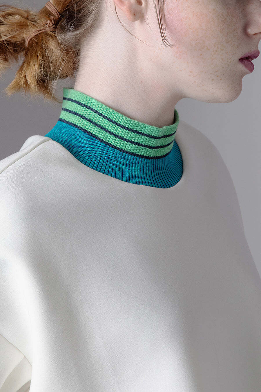 ネックと袖口には目の引く編立リブを施し、スタイリングにさりげない遊び心をプラス。