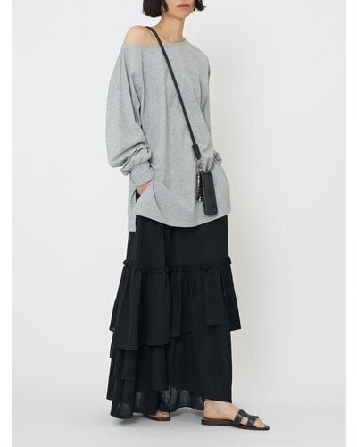 そのままさらっと着ていただくのも素敵ですし、片側に抜いて肩を見せたり、深めに開いたサイドスリットを活用してボトムにインしたり、着用アレンジも楽しめる1枚。