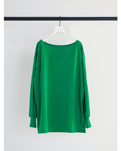 すっきりと美しく開いたボートネックラインと、ふんわりとしたボリューム感ある袖がキャッチー。