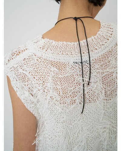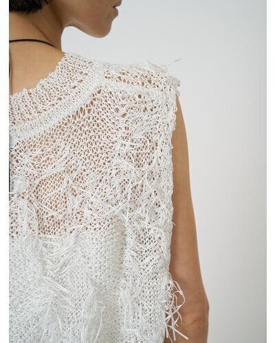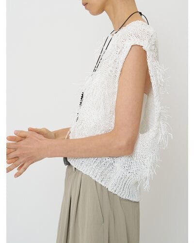 それを部分的にカットしフリンジを作っている、印象的な編み地のニットベストです。
