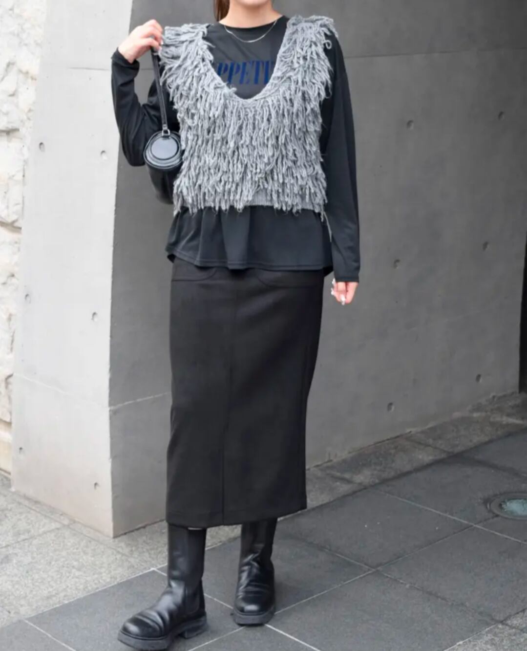 存在感のある編み地ながら、Vネックデザインで顔まわりをすっきり見せてくれます。