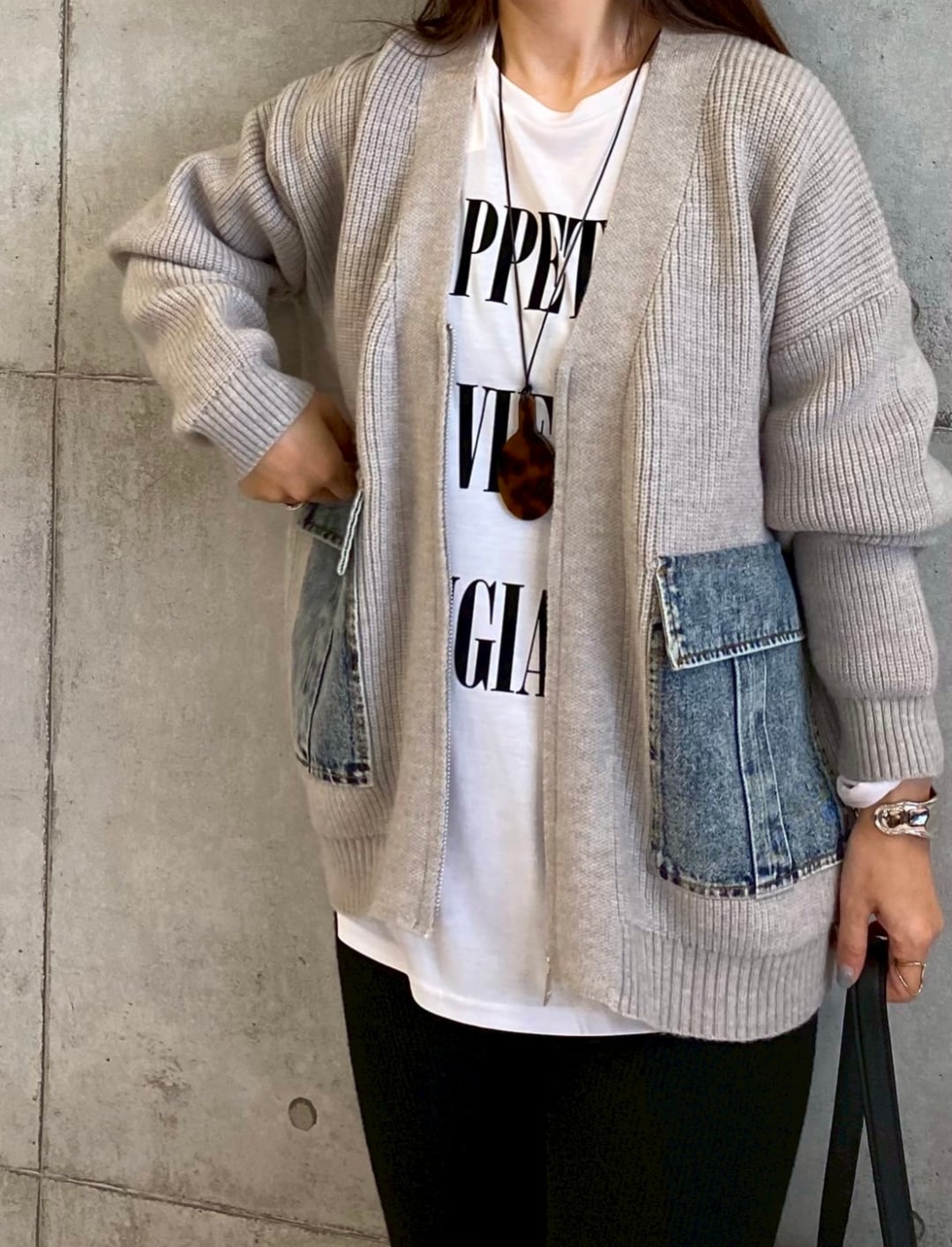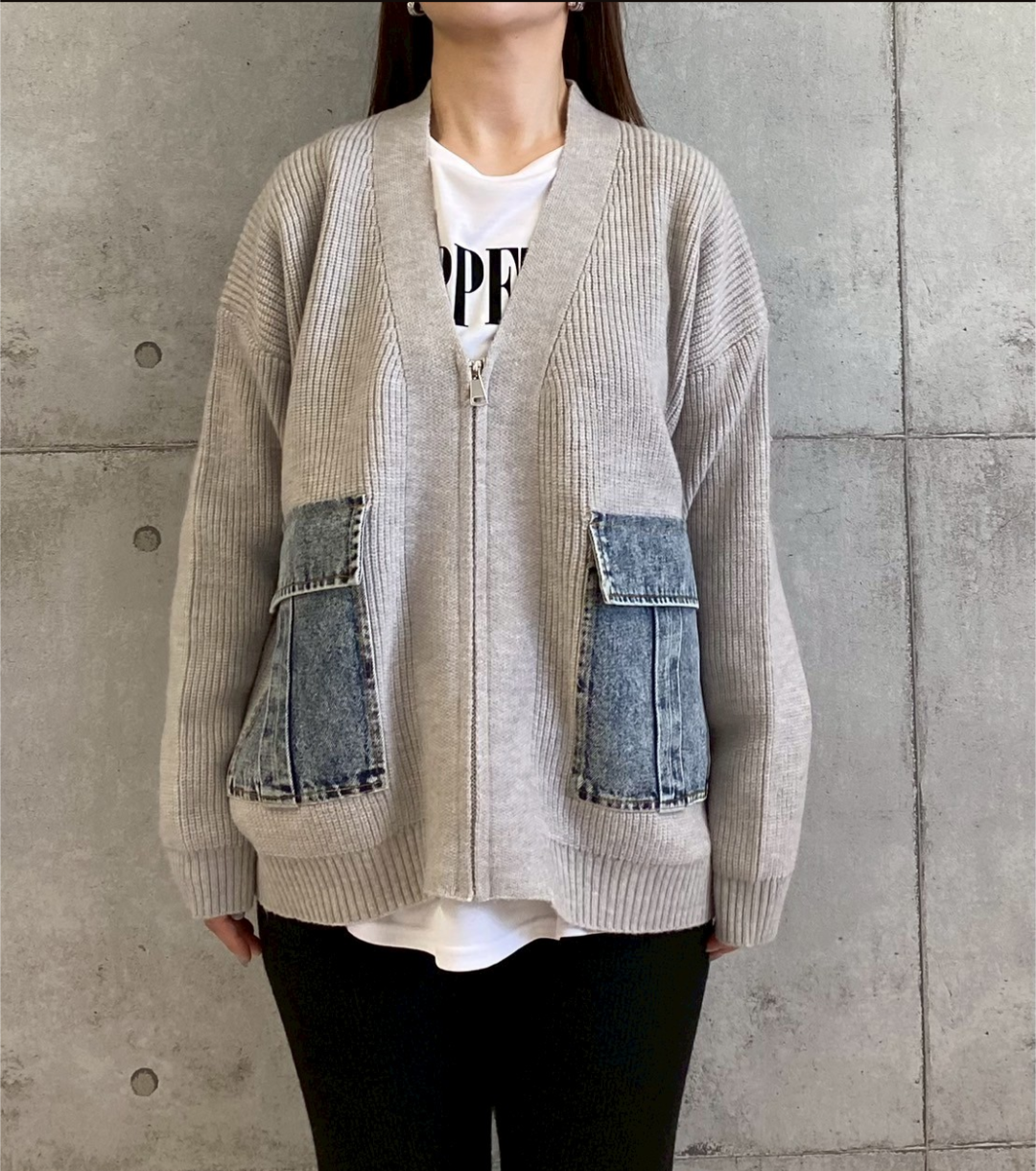 もちもちとした肌触りの良いニット素材に、デニムポケットを組み合わせた異素材切り替えが目を惹くデザ インカーディガン。インポートライクな雰囲気が漂い、シンプルながらも洗練された大人のカジュアルスタイ ルを演出します。前開きはファスナー仕様で、着脱もスムーズ。ややゆとりのあるシルエットが体のライン を拾いにくく、気になるヒップ周りもさりげなくカバーしてくれるのも嬉しいポイントです。
