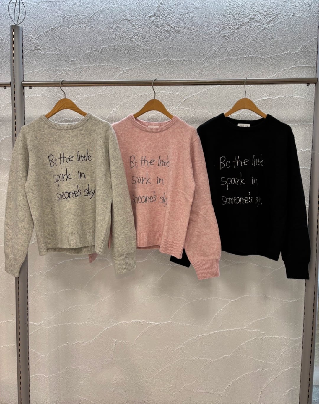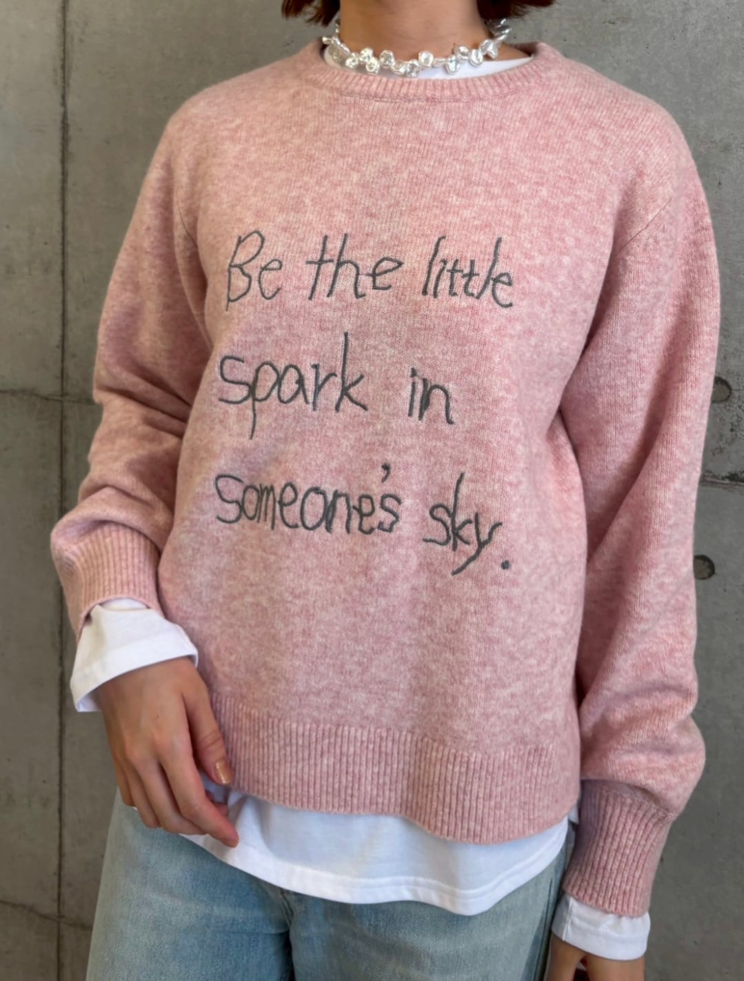 手書き風のロゴを刺繍で施したニットです。 ニット素材は温かみのある糸でお作りしています。