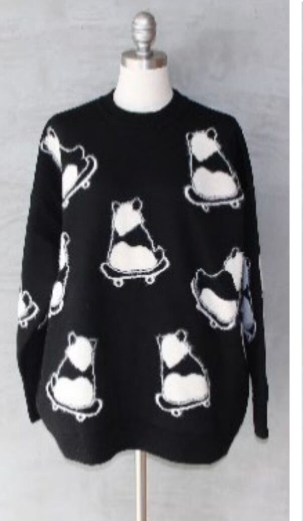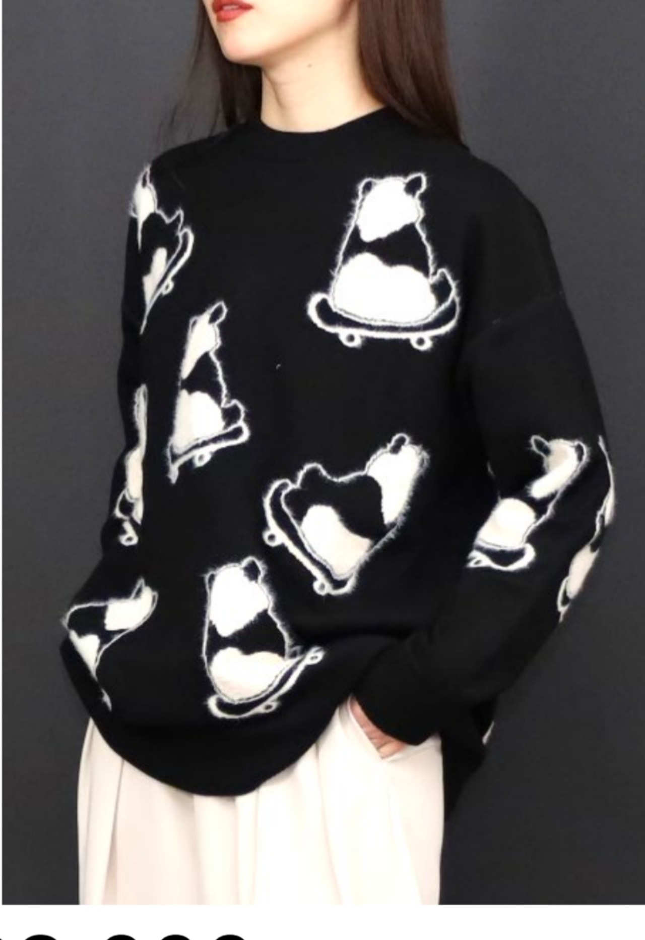 後ろ姿スケボーパンダがニットの模様に 毛足の長いふわふわ糸で表現されたニットトップス