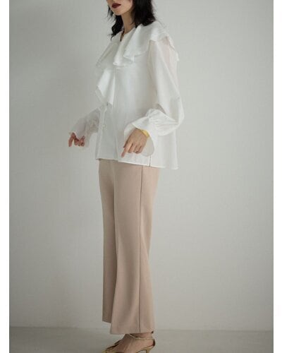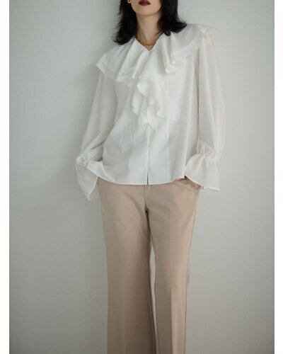 軽やかなラッフルと上品な艶めきが、顔まわりをパッと明るくするブラウス。