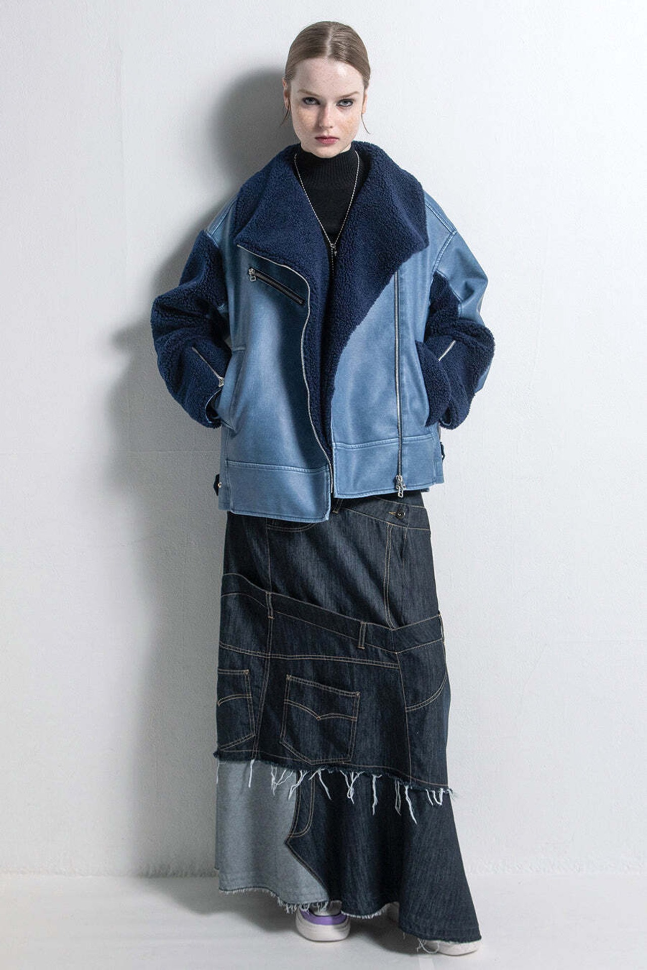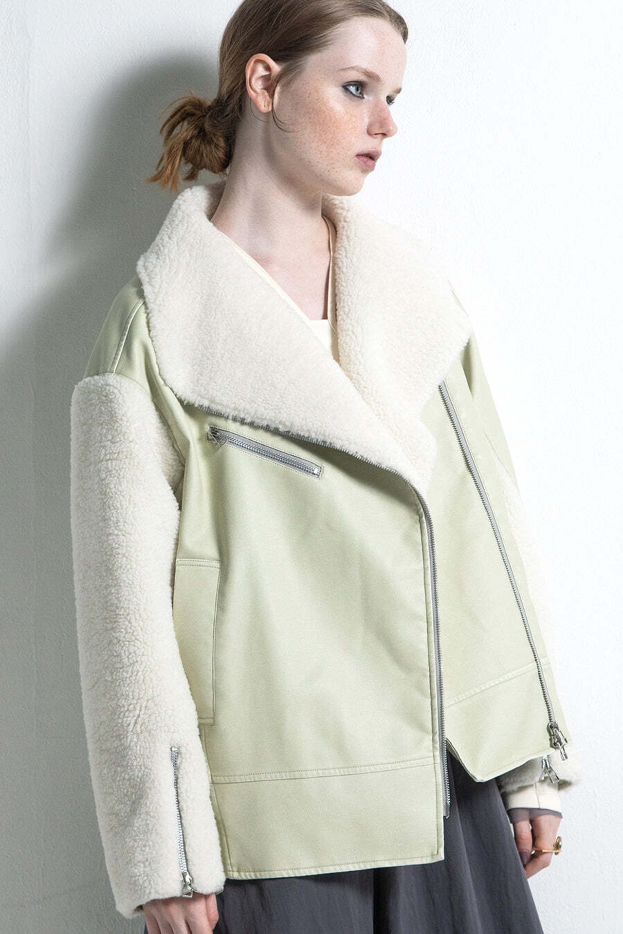ショールカラーのボアが、エッジィになり過ぎず大人でも着やすい抜け感のある