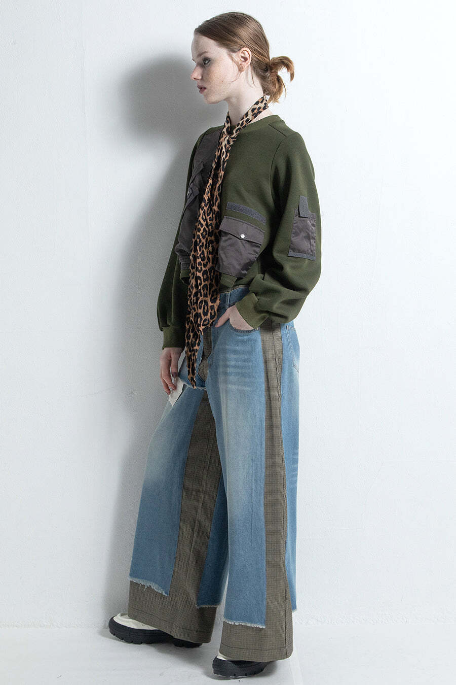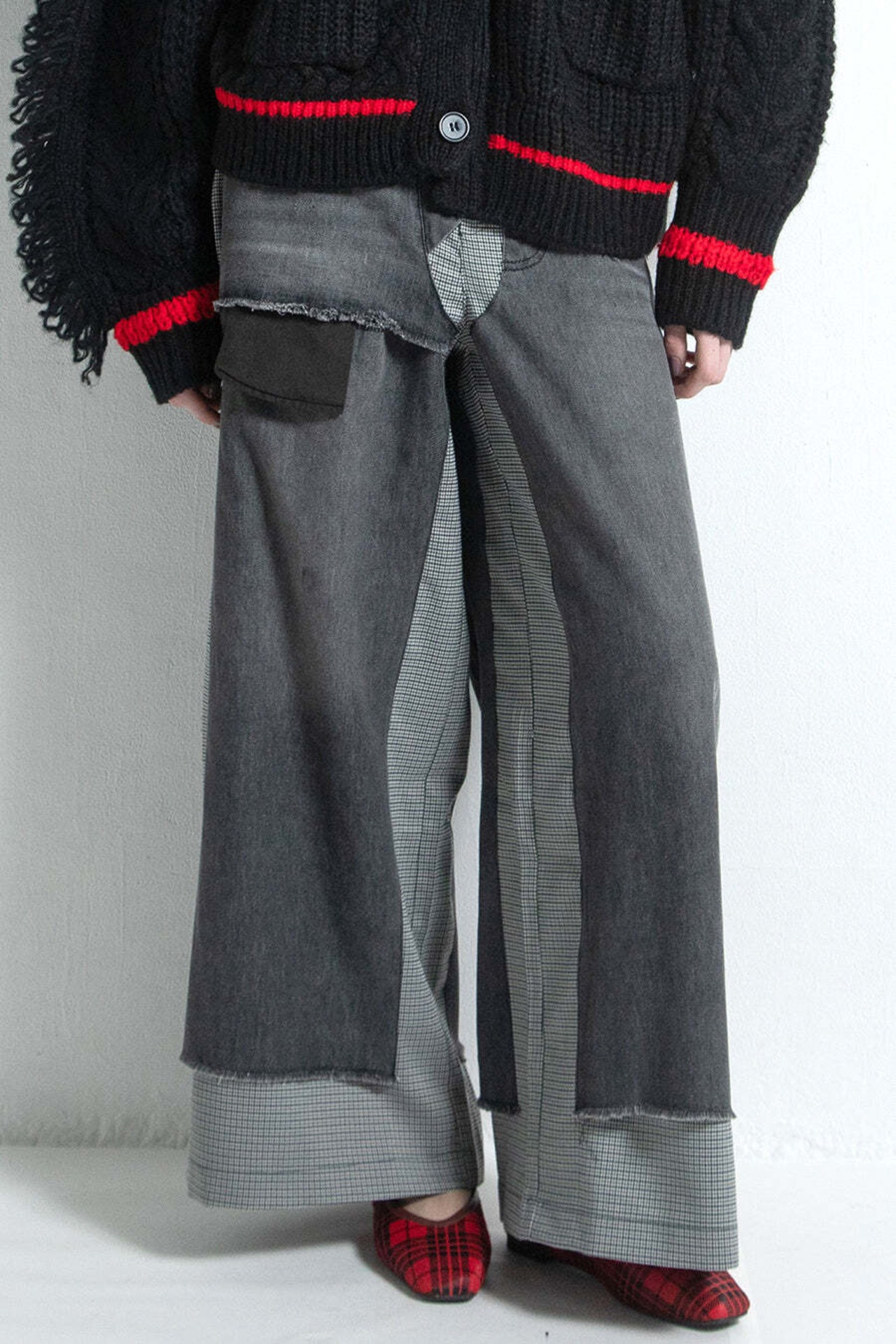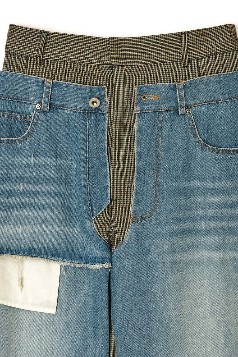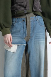 デニムを重ねたような、遊び心あるレイヤード風パンツ。