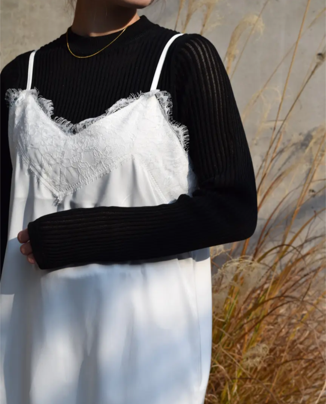 お手持ちのトップスの上から重ねるだけで、トレンドのレイヤーでスタイルが完成。