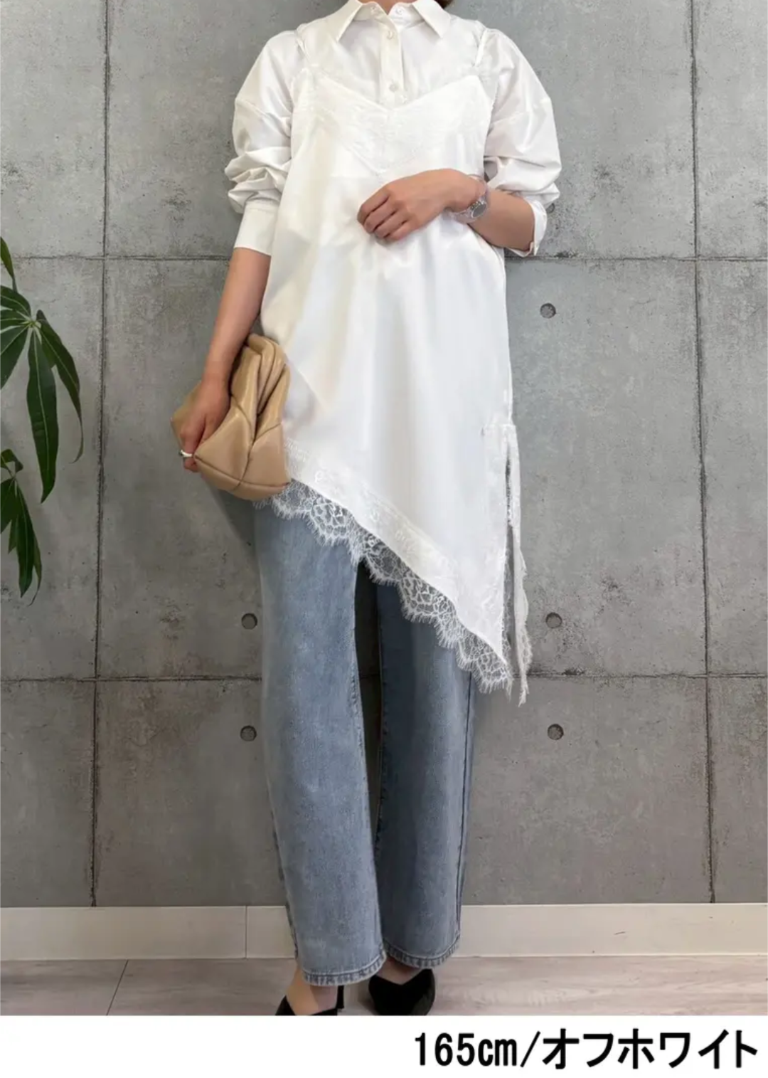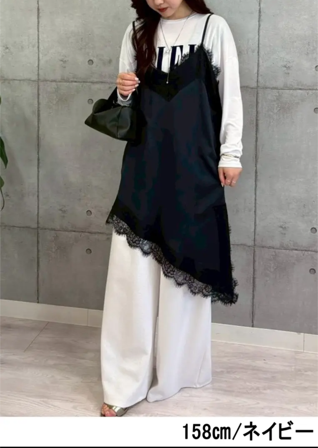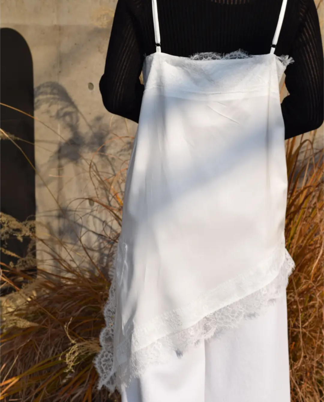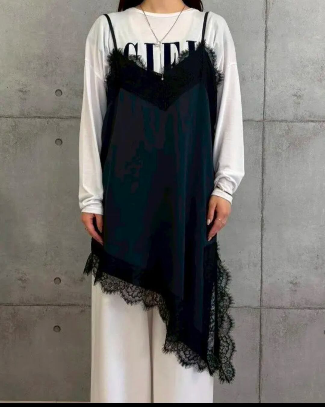 アシンメトリーな裾ラインと繊細なレース使いが、シンプルながらも存在感のあるデザイン。肩紐や裾のレースが女性らしさを引き立て、いつものコーデにプラスするだけでこなれた印象に仕上がります。