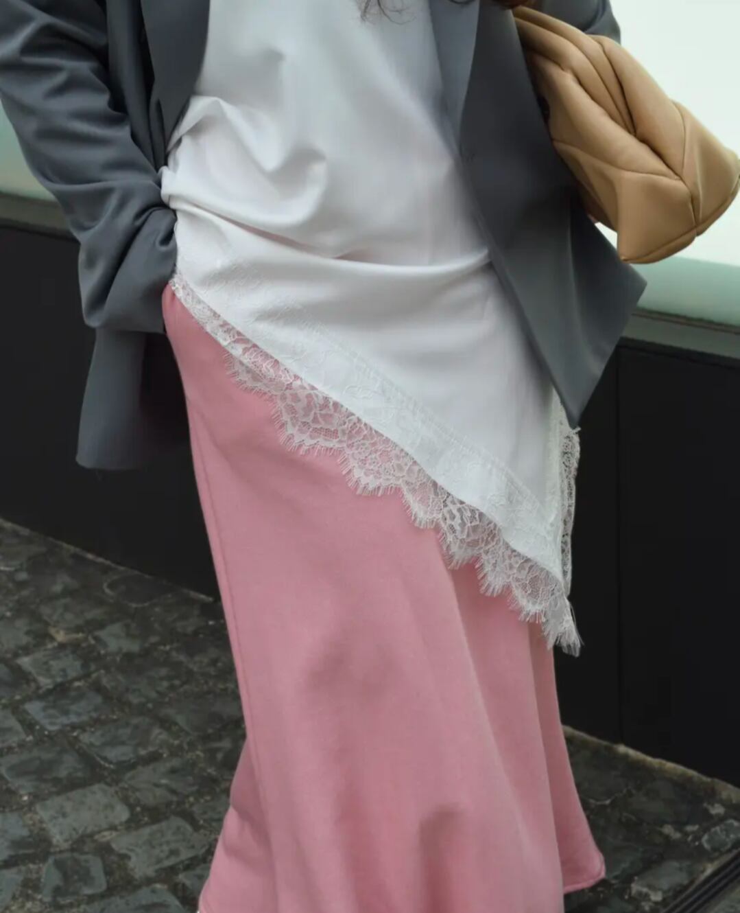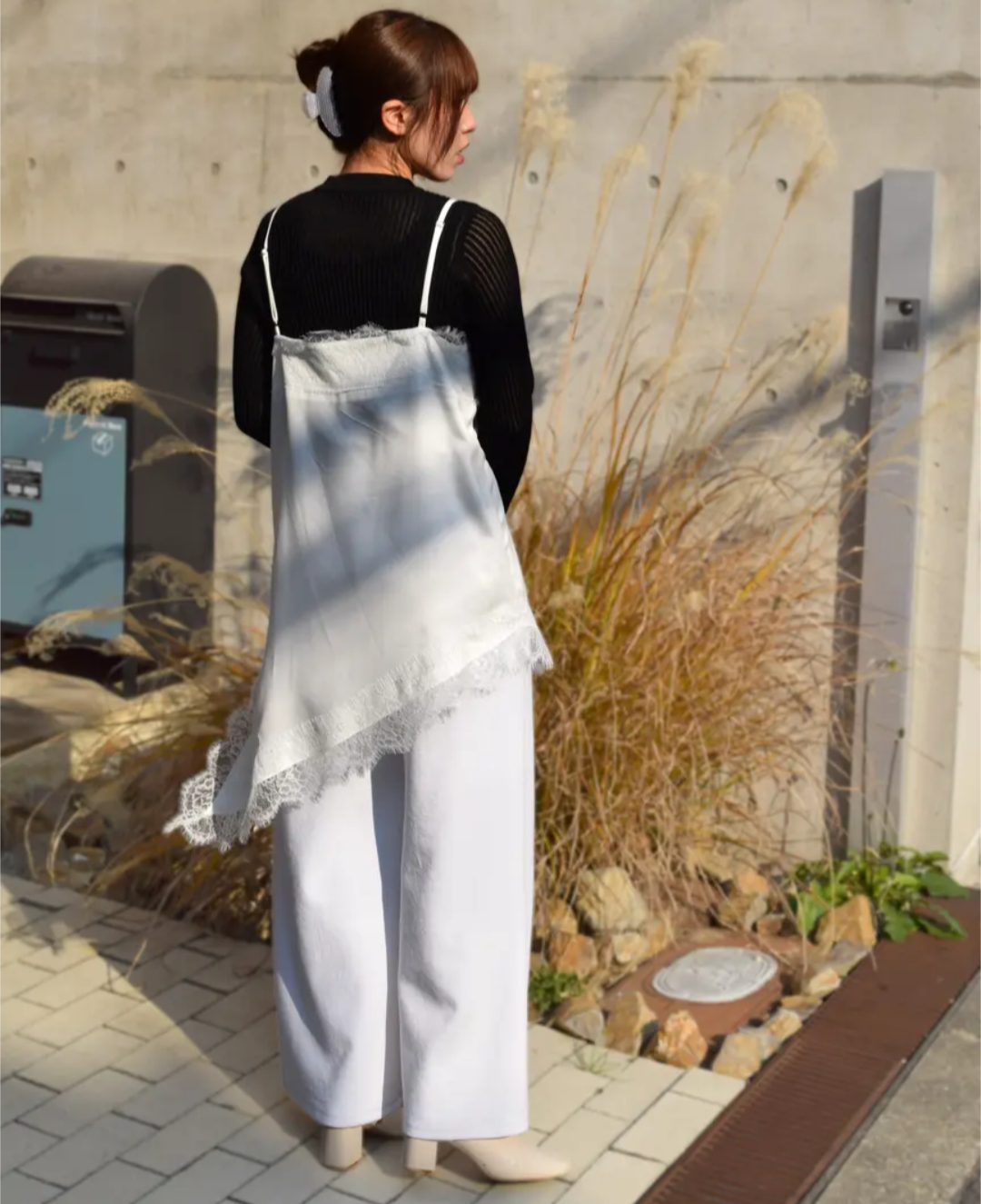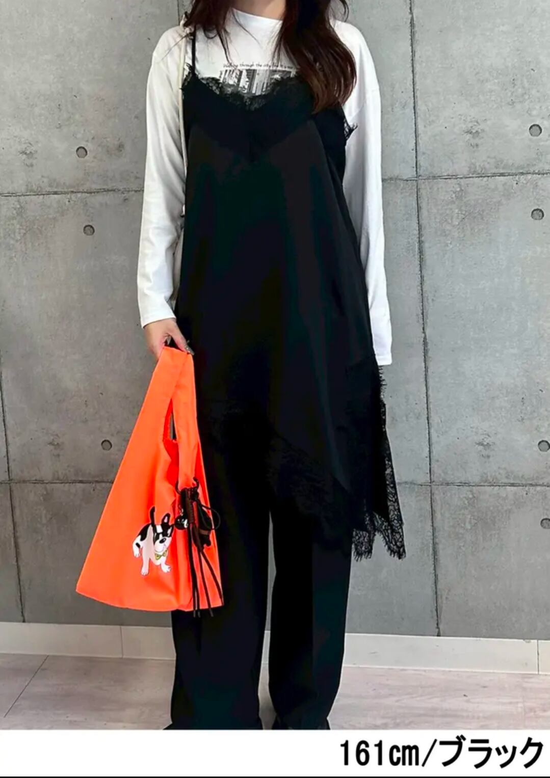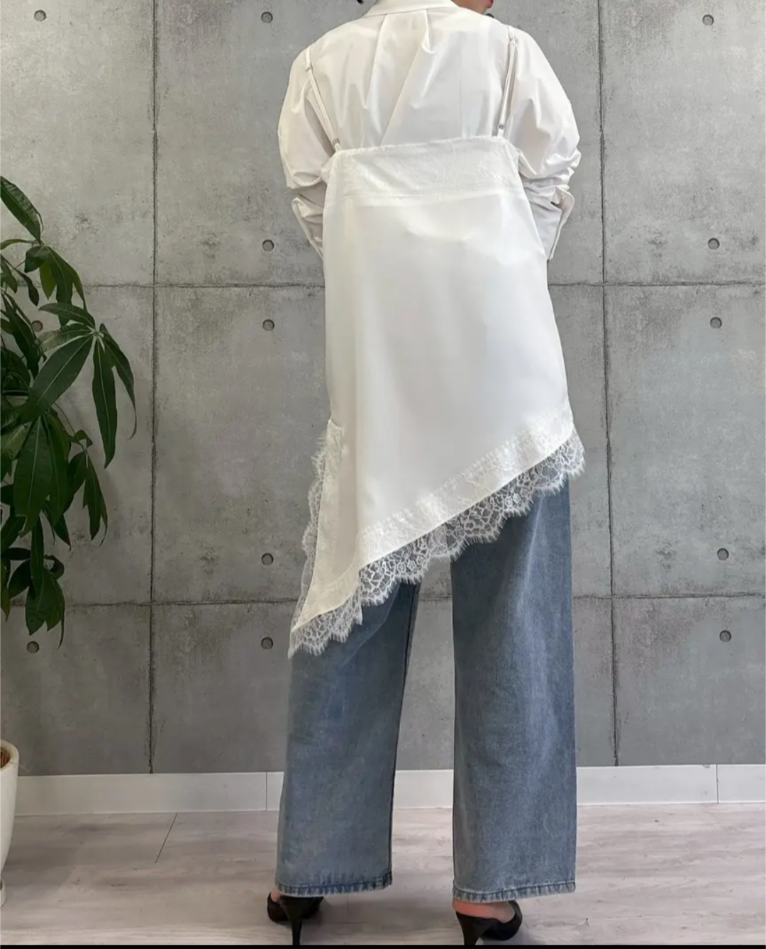 アシンメトリーな裾ラインと繊細なレース使いが、シンプルながらも存在感のあるデザイン。肩紐や裾のレースが女性らしさを引き立て、いつものコーデにプラスするだけでこなれた印象に仕上がります。