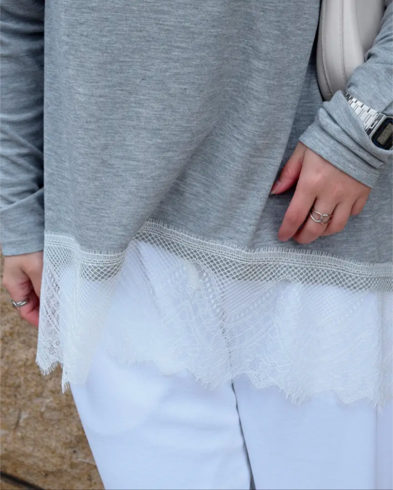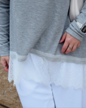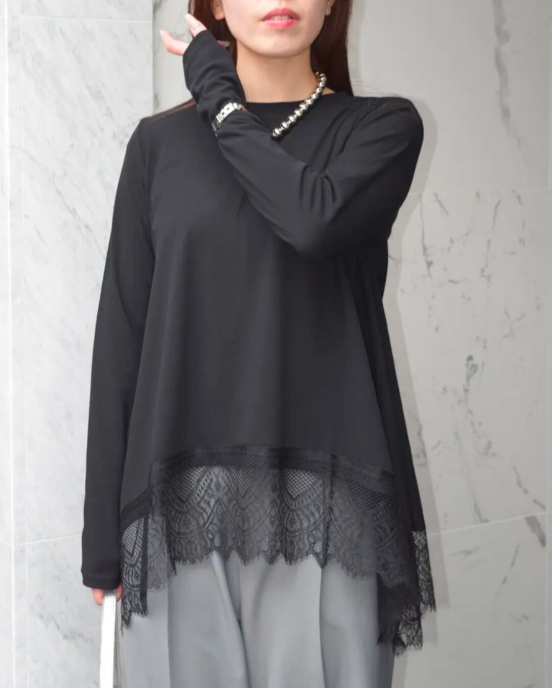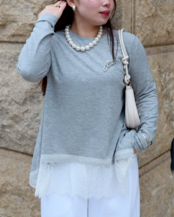 柔らかなカットソー素材に、裾部分は繊細なレースをドッキングしたデザイントップス。裾のレースがさりげなく女性らしさをプラスし、シンプルながらも一枚で存在感のある仕上がりに。