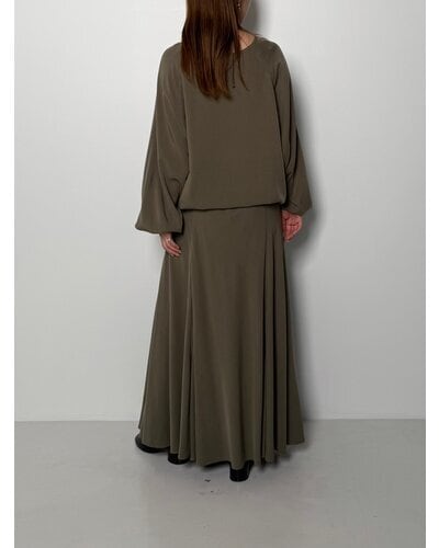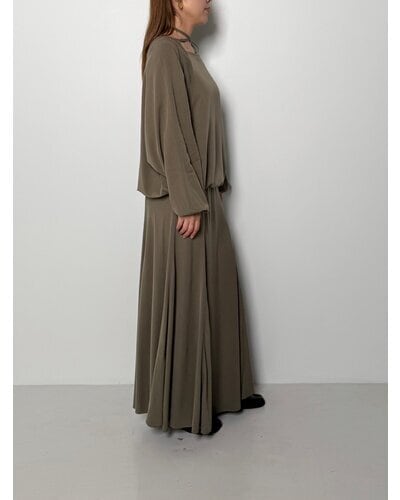 女性らしいアイテムにあえて加工を施し、CHIGNONらしくカジュアルに仕上げました。生地を贅沢にたっぷりと使い、裾まわりにボリュームが生まれる綺麗なシルエットに拘りました。歩く度に裾の生地がきれいに揺れる、着映えするアイテムです。ウエストはゴムとテープ入りのイージー仕様で、裾には短めのスリットがあるデザインです。
