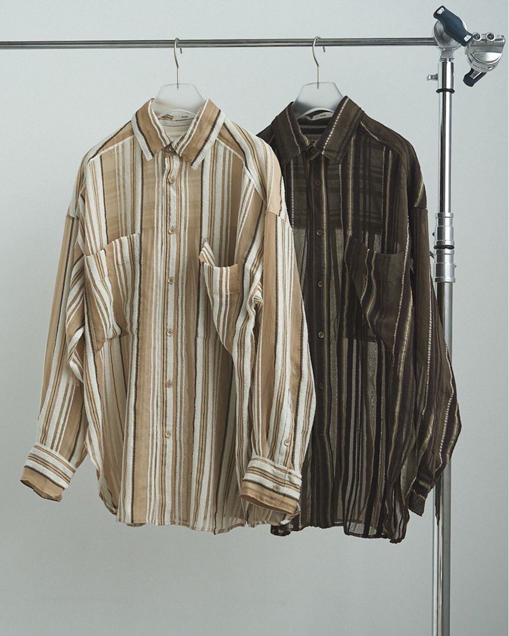 日本の桐生で織り上げたオリジナルのストライプ生地を使用したオーバーシャツ。全体はシアーに仕上げ、ライン部分はモールヤーンを使い立体的なストライプにしています。切り替え部分に、カットオフされた無地のシアー素材を挟み込んでいるのもポイント。ゆったりとしたサイジングの抜け感あるシルエットです。シンプルなボトムに合わせるだけで映える一枚です。
