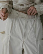 立体的な大きめのサイドポケットが印象的なドロストパンツ。筒の中心に切り替えを入れ3本ステッチを効かせ、ウエストコードは金属パーツをあしらい、カジュアルに仕上げています。程良く光沢した、しなやかな中肉のツイル素材と、ほんのりフォルムをキープできる独特な風合いが魅力。ゴム仕様のウエストで、ラフに履いていただけます。