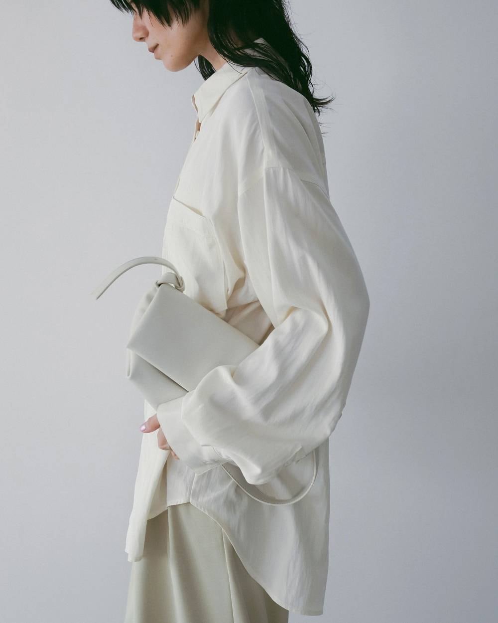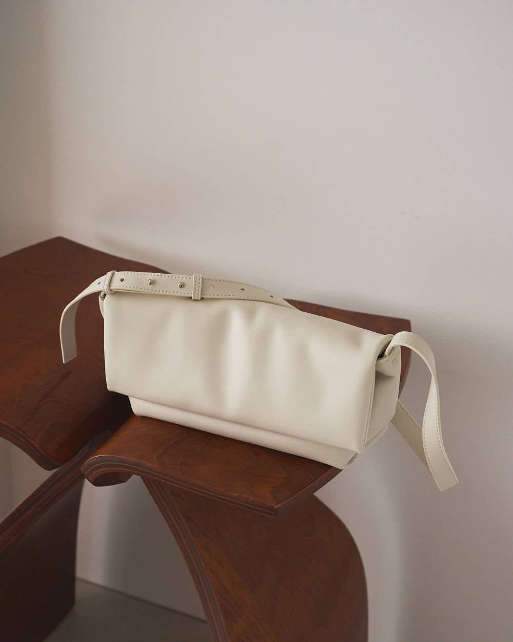 しなやかでマットなエコレザーを使用したミニBAG。フロントのかぶせ部分で優しく包み込んだふんわりとした横長のフォルムが特長。手に持った際の柔らかな風合いも魅力です。肩紐は、ぎぼしパーツで長さ調節が可能。肩掛けしたり、長くしてショルダーバックとしてや、手にラフにそのまま持ったり、紐を一番短くして長めに紐を垂らしたりと、お好みに合わせていろんなスタイルを楽しんでいただけます。内側は小物を入れるのにも便利なポケット付きで、財布や化粧ポーチ、スマホなどが十分に入るサイズです。