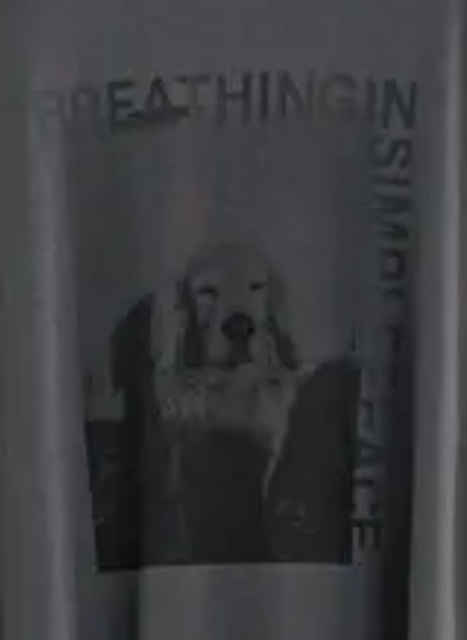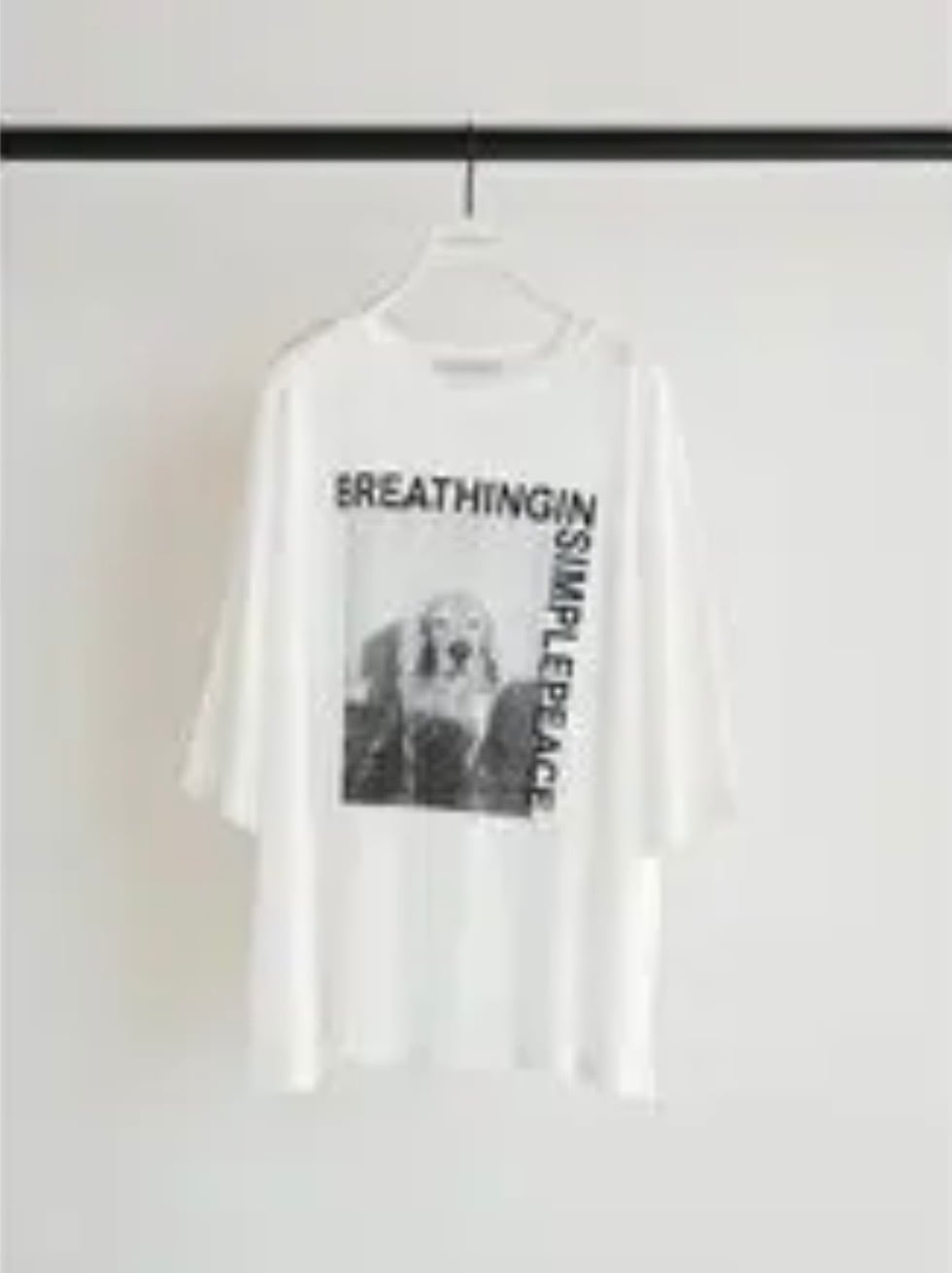 今回はアニマルPhotoをセレクト。Photoとロゴの絶妙なバランスが、スタイリングにキャッチーさをプラスしてくれます。ゆるい印象を与える犬に、BREATHING IN SIMPLE PEACE=”穏かな平和を深く吸い込む” を添えて。