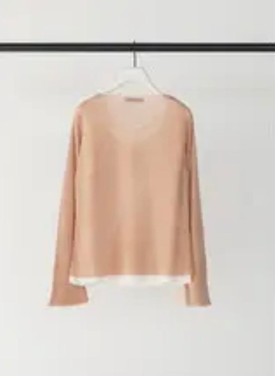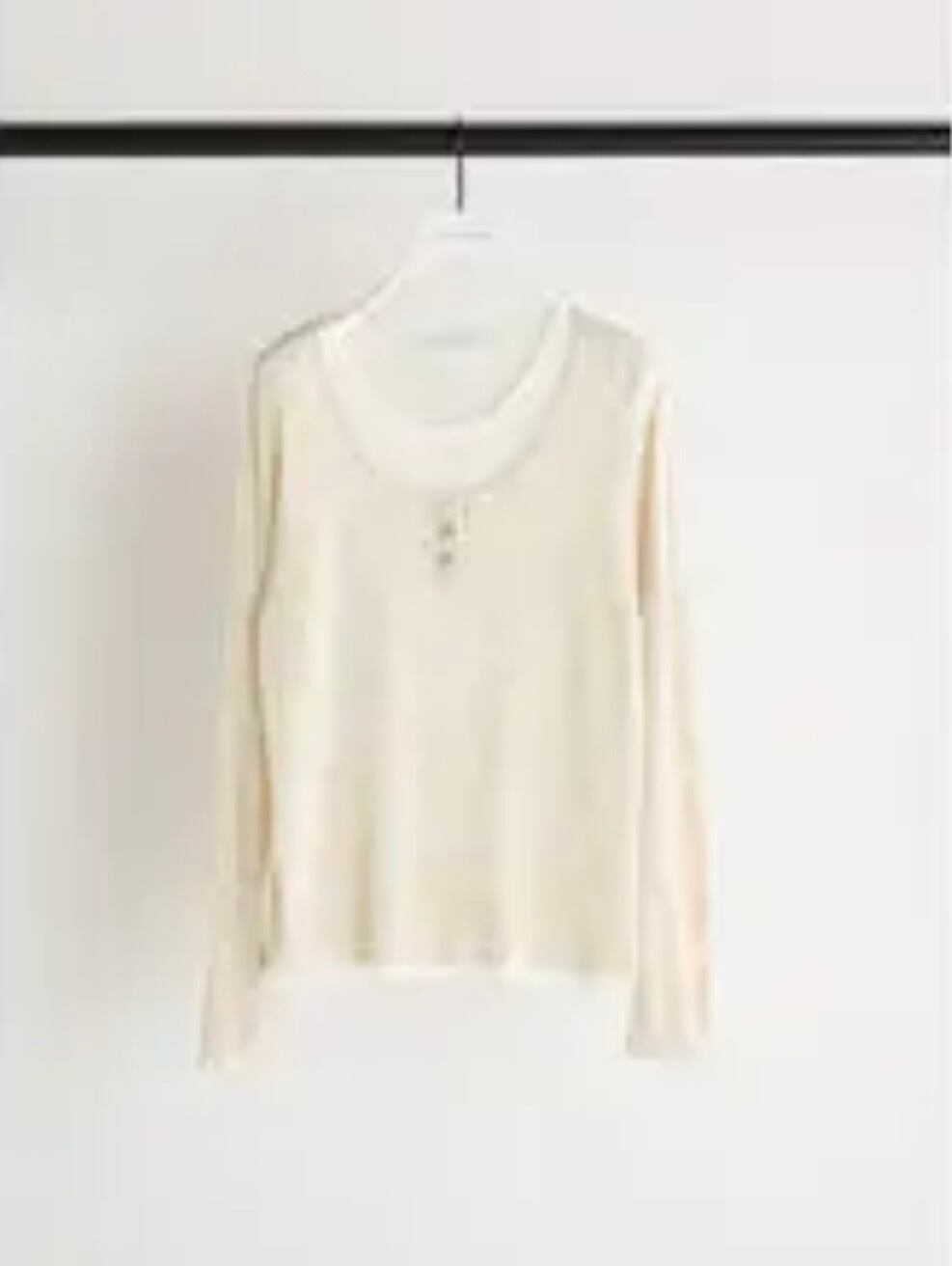 前身頃側だけタンクトップをレイヤードさせていますが、シアー感のある素材なので、下のタンクが透けて見えて、本当にタンクを重ねているように見えるのがポイント!