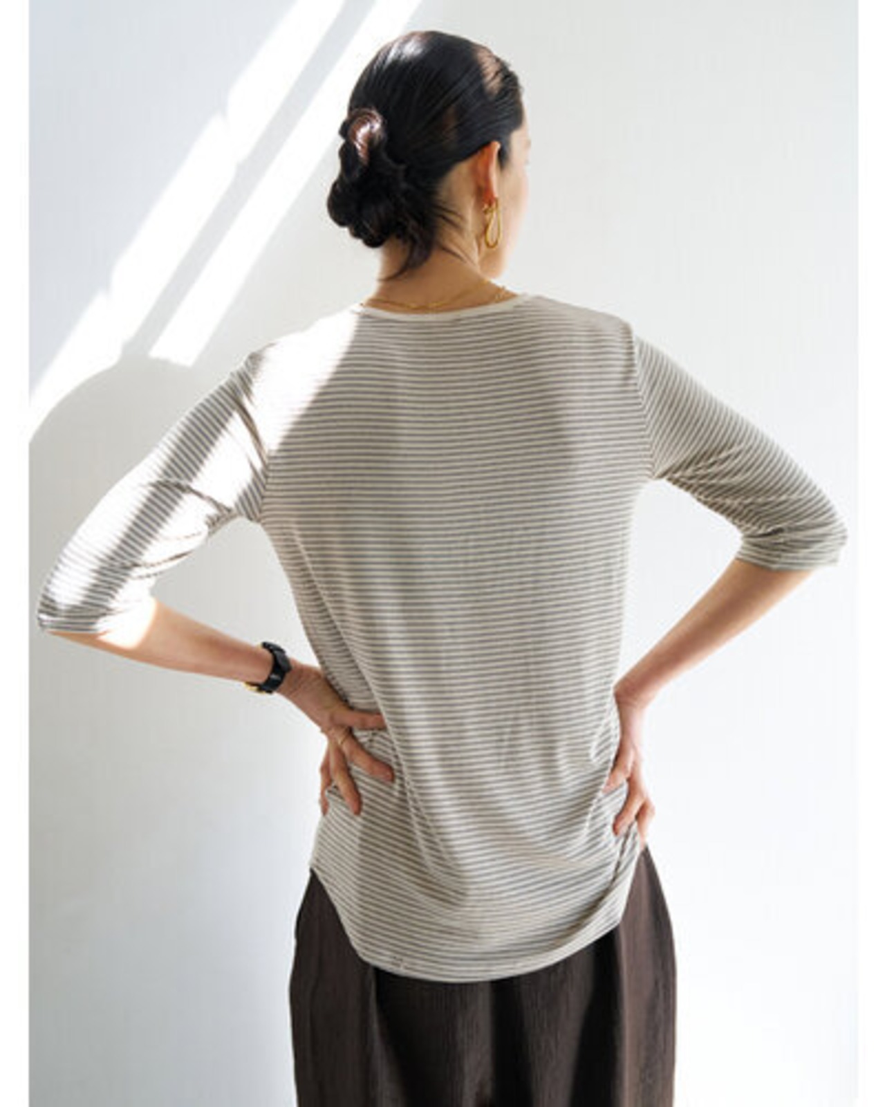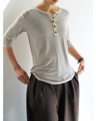 レーヨン混率を高めたしなやかな素材は、なめらかな肌触りと自然な落ち感が特徴。カジュアルなボーダーも、落ち着いた印象で着用いただけます。