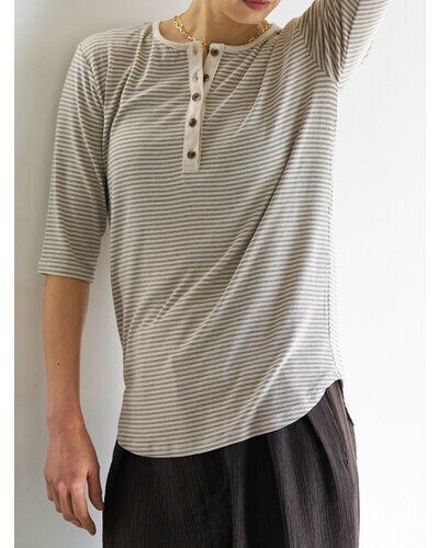 衿とヘンリーあきの前立て部分は、ボーダーのベースカラーに合わせた無地素材でトリミング。さりげない配色が全体を引き締めます。