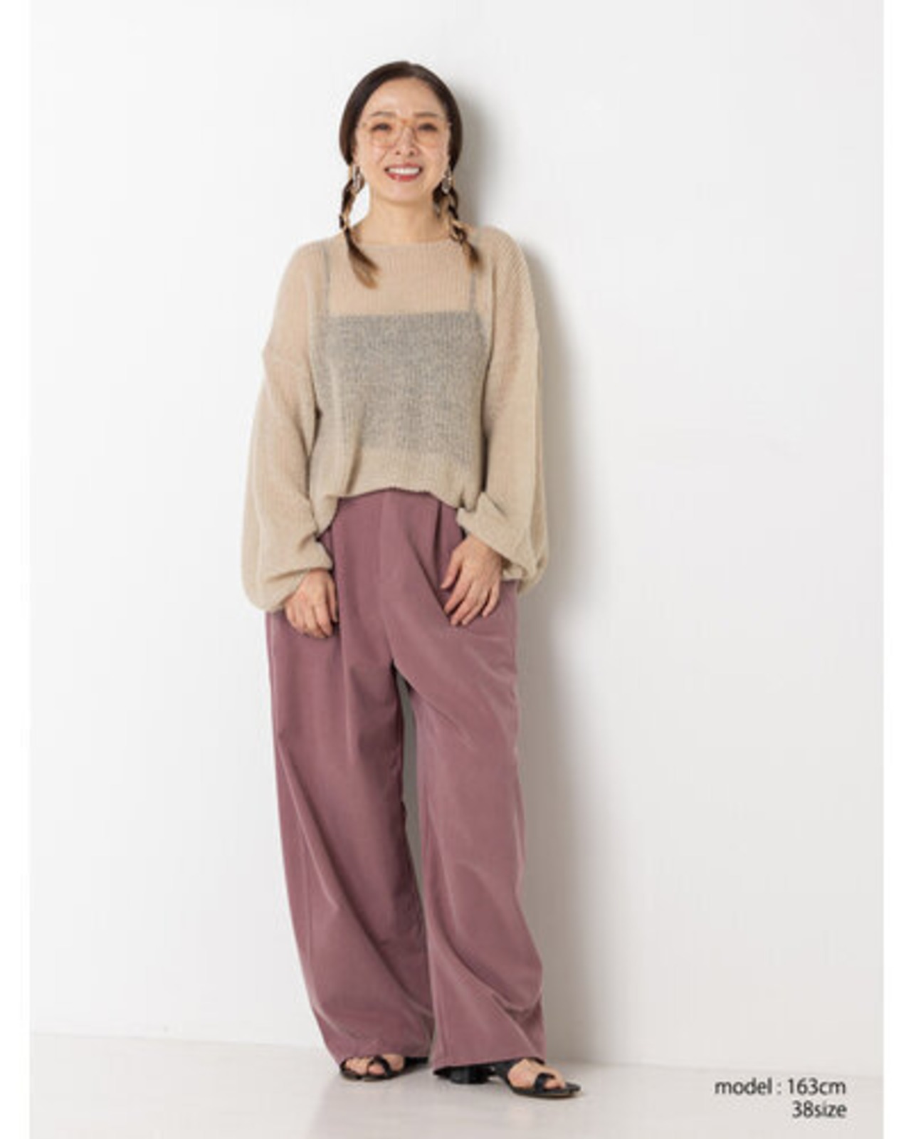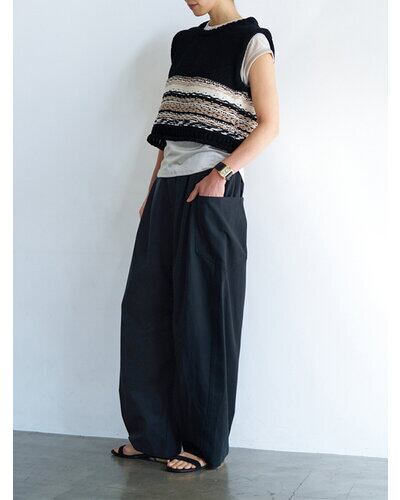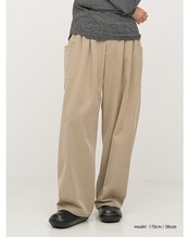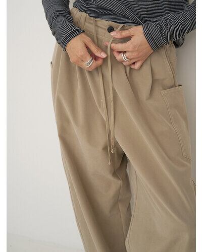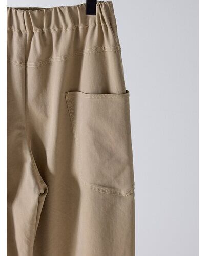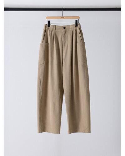 上質なドレープ感と微光沢のあるレーヨン混のツイ ル生地を使用。女性らしい素材感とマニッシュな雰 囲気がMIXされた大人のカジュアルパンツに仕上げ ました。脇に施したビッグポケットデザインは、ヒ ップを程よくカバーすることで小尻効果に。とにか く大容量のポケットで、仕事で使用する書類やペットボトルなど、通常のパンツでは入らないような物 も収容できるので、実用的なのもうれしいポイントです。ウエストはALLゴムの