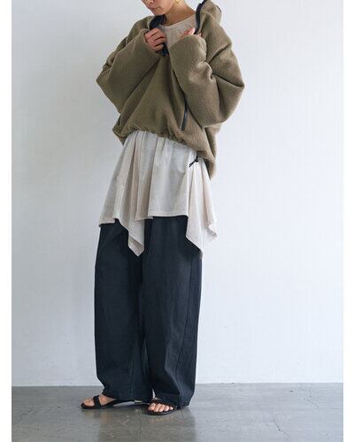 ファスナー開き仕様、ベ ルト裏に紐をとおしてあるので、さまざまなサイズ に対応できるよう設計しています。裾は靴の上で止まるように少し小さめにしてあるので、裾を引きずりにくくなっています。